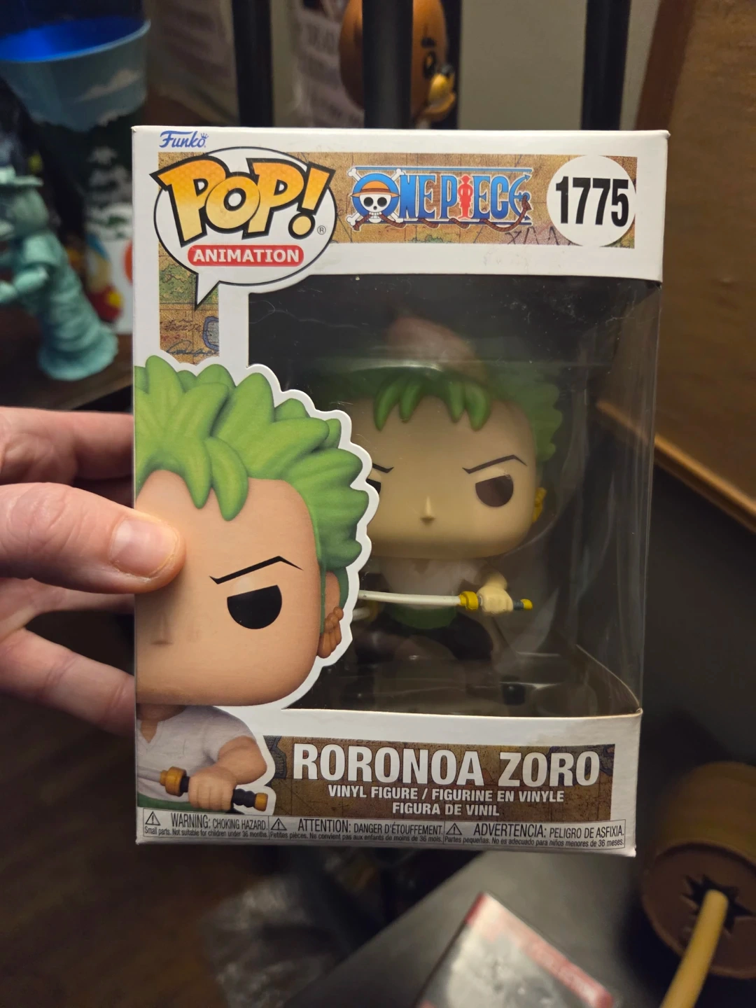 This is a Funko Pop! Animation vinyl figure of Roronoa Zoro, number 1775. It's still in its original box. This collectible is designed for fans of the One Piece series.