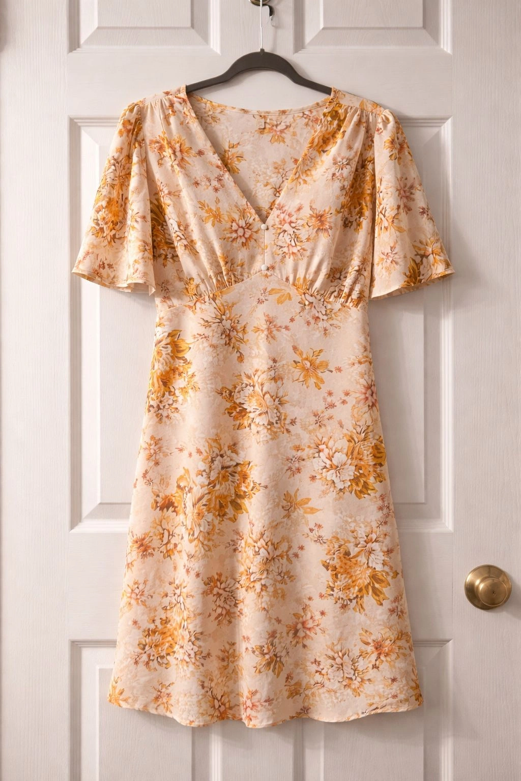 Soft floral dress with flutter sleeves and a flattering empire waist. Lightweight and flowy with a relaxed fit—easy to dress up or down. Looks great worn loose or styled with a belt and cowboy boots for a boho/festival vibe. Worn Once. Brand: SHEIN. Tag size: Small (fits Small to relaxed Medium). Fabric: 100% polyester. Color: Cream with warm floral print. Condition: Gently used, no flaws noted. Measurements (flat): Bust: 17”, Waist: 17”, Hips: 20”, Length: 32” (shoulder to hem). Feel free to message if you have any questions!
