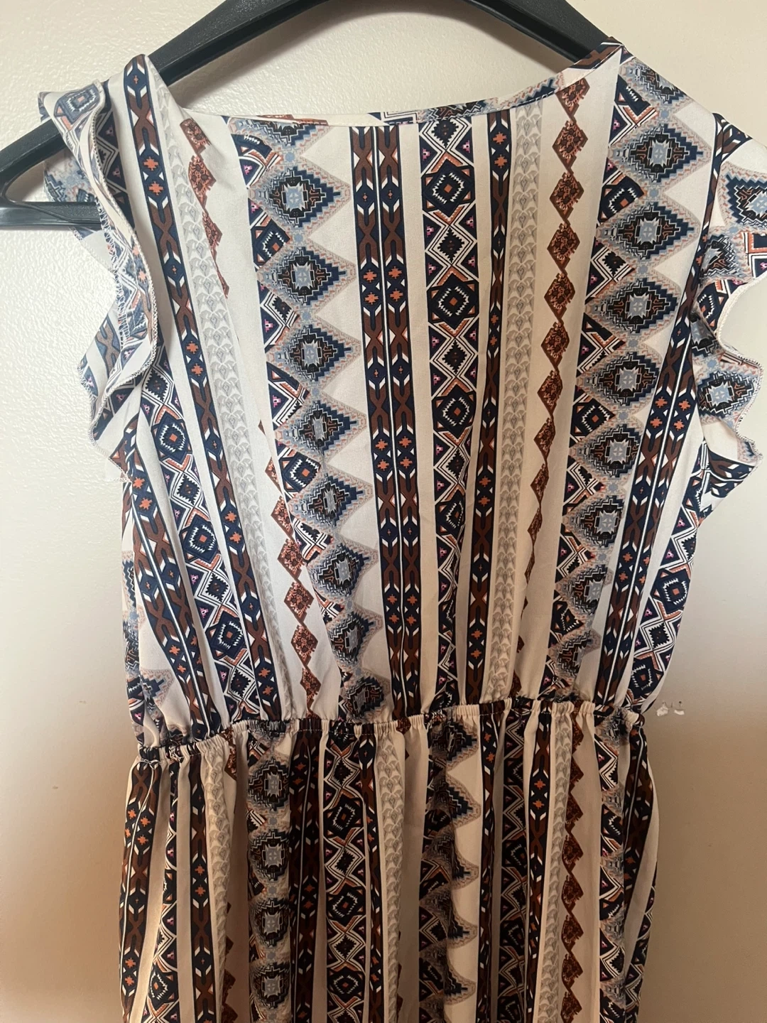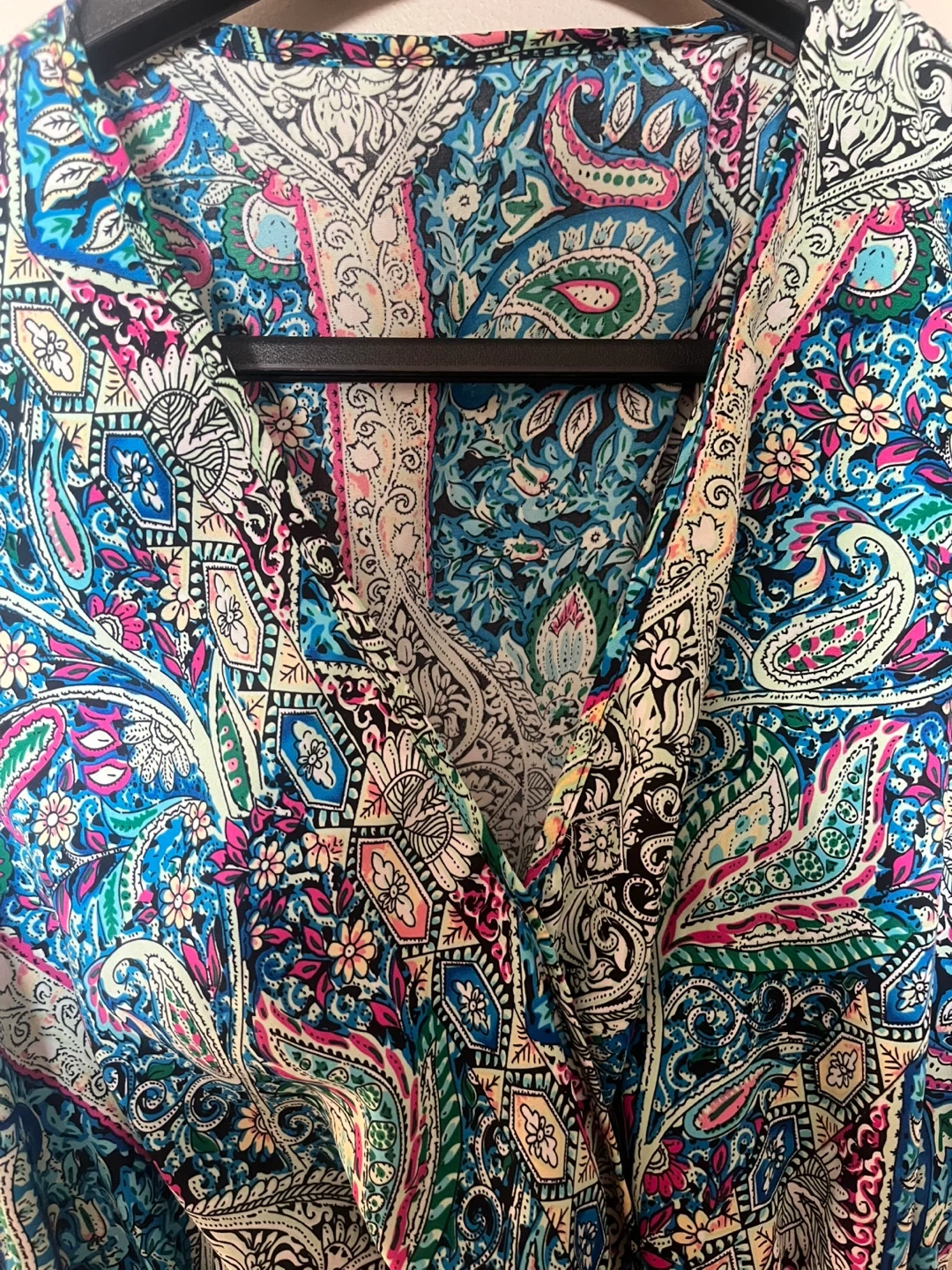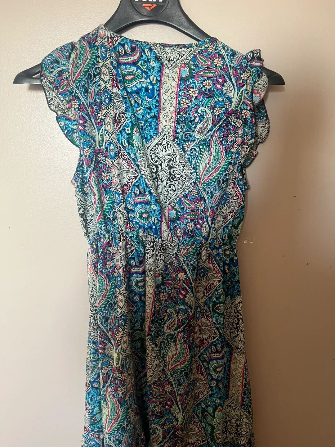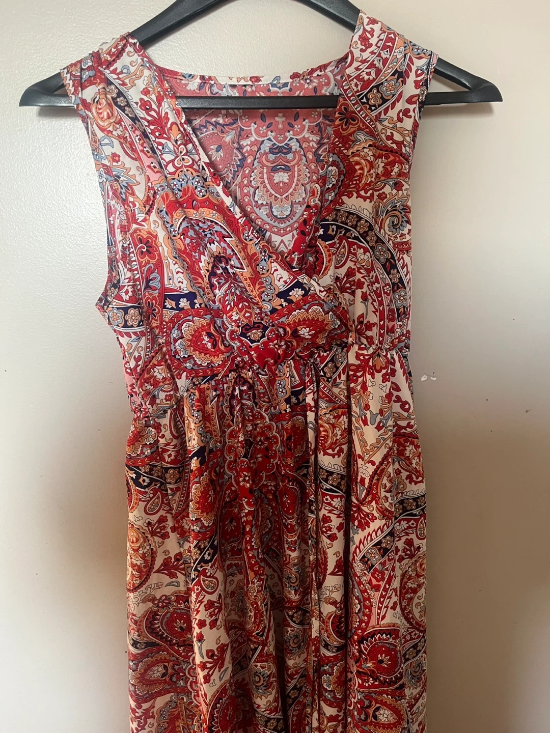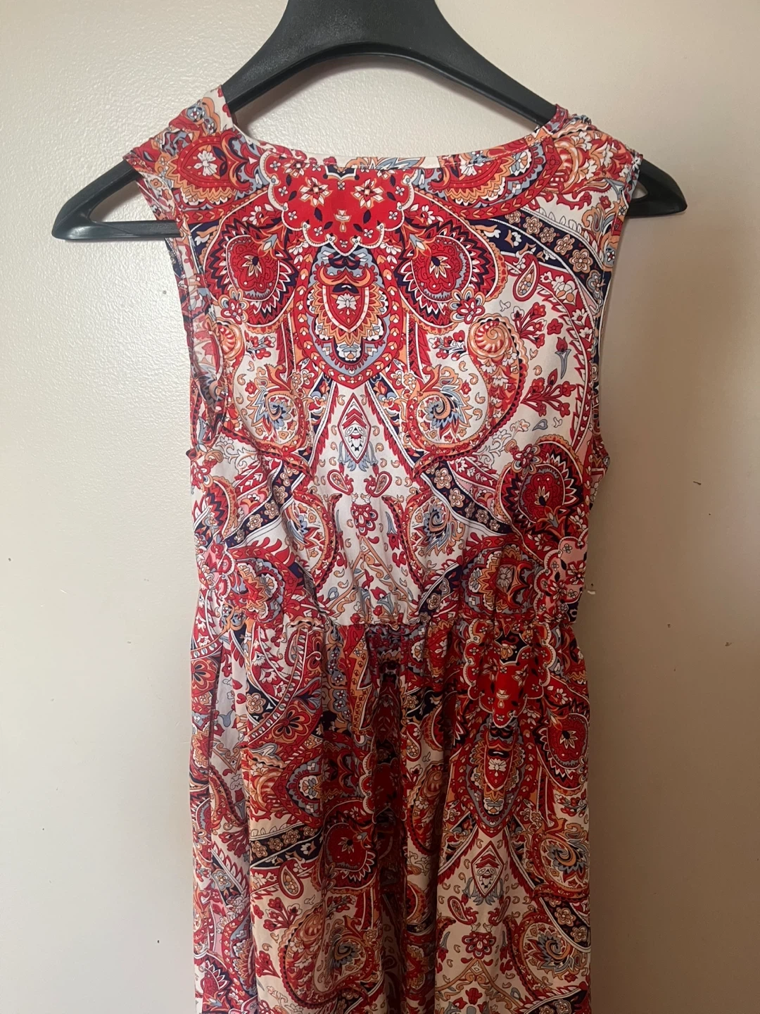 This sleeveless maxi dress features a vibrant paisley print in red, white, and blue. It has a V-neckline and an elasticated waist for a comfortable fit.