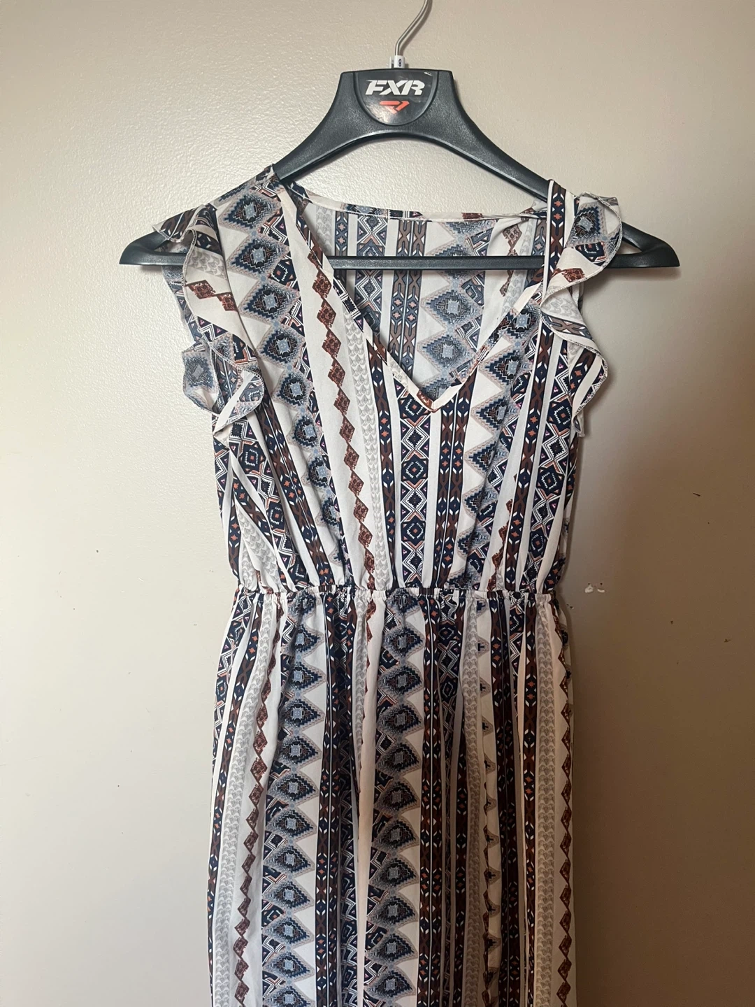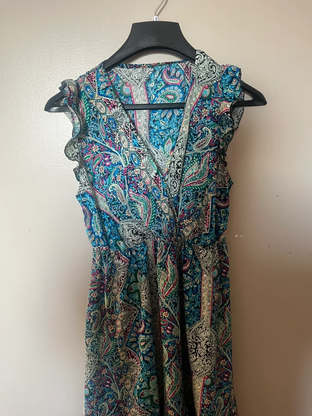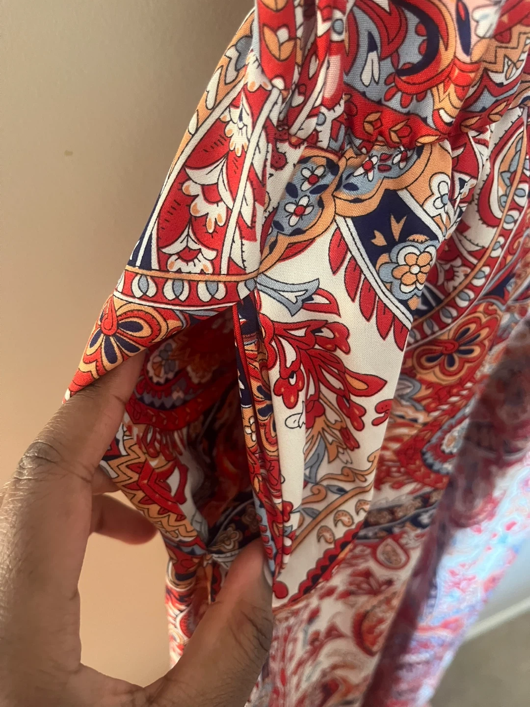 This sleeveless maxi dress features a vibrant paisley print in red, white, and blue. It has a V-neckline and an elasticated waist for a comfortable fit.