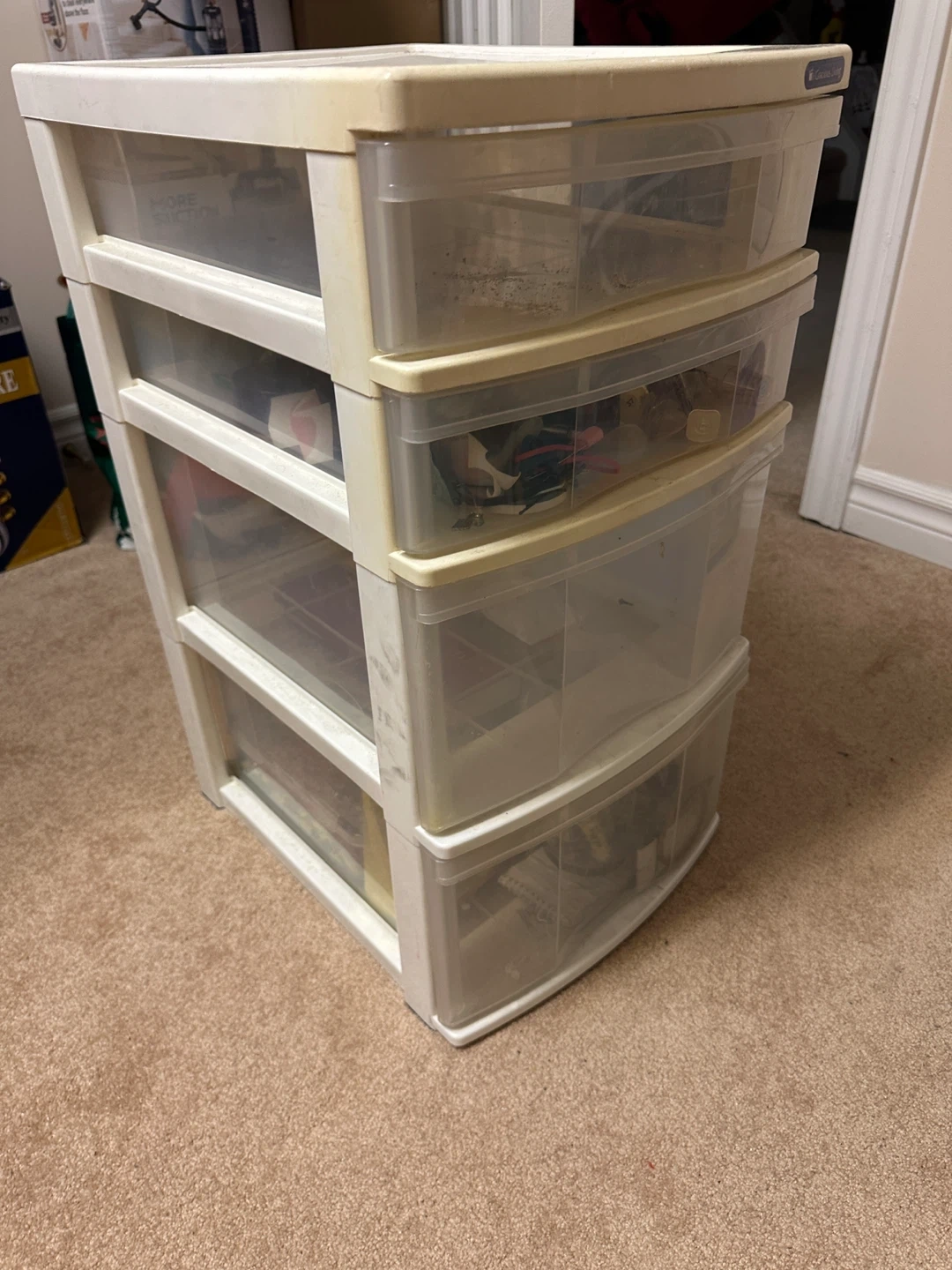 This is a cream-coloured plastic drawer storage unit with four drawers. It's great for organizing small items. The plastic construction makes it easy to clean.