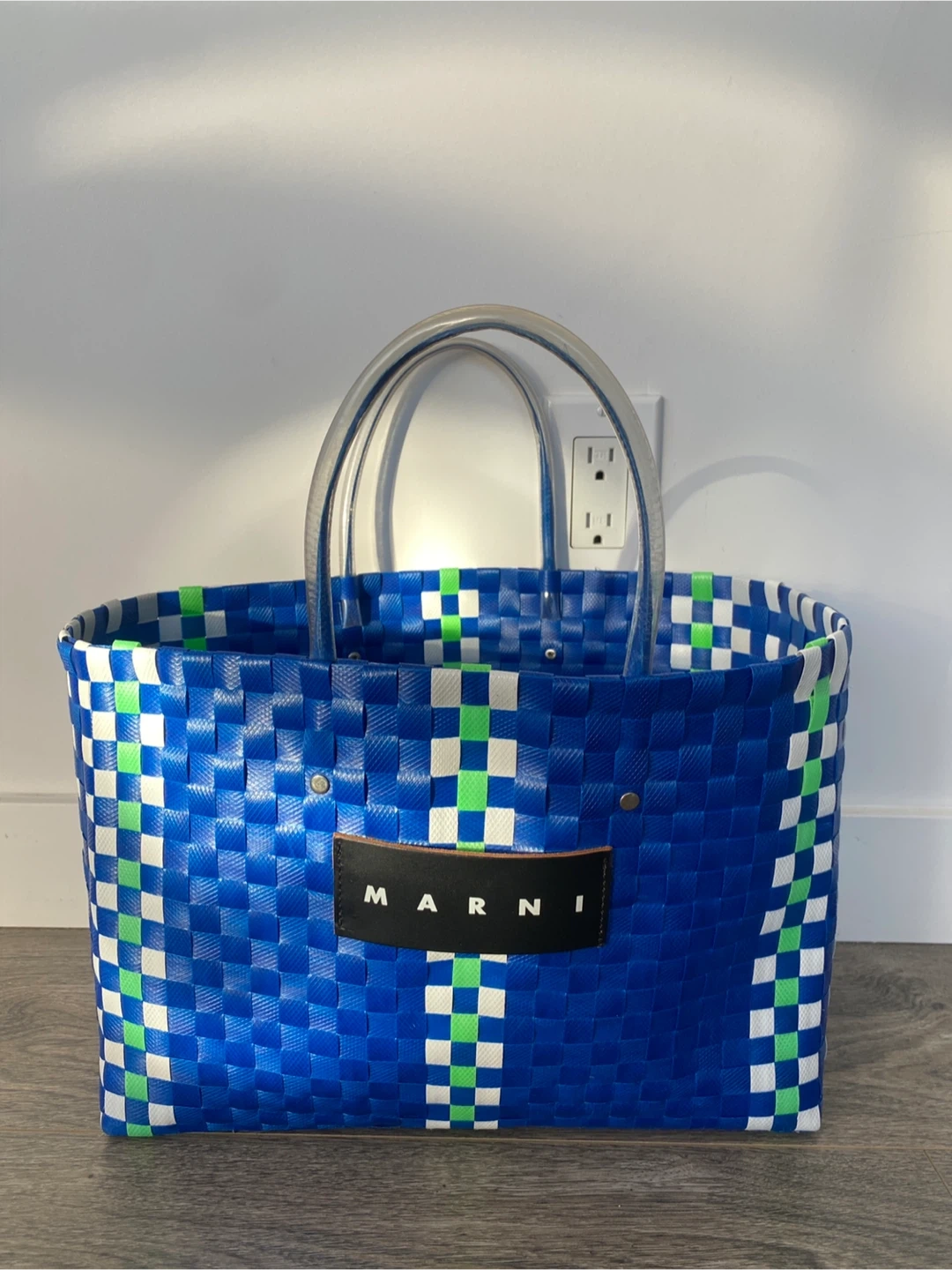 This Marni tote bag is woven with a blue, white, and green checkered pattern. It features clear acrylic top handles. Perfect for carrying essentials or as a stylish accessory!