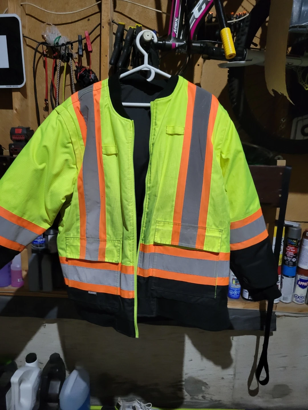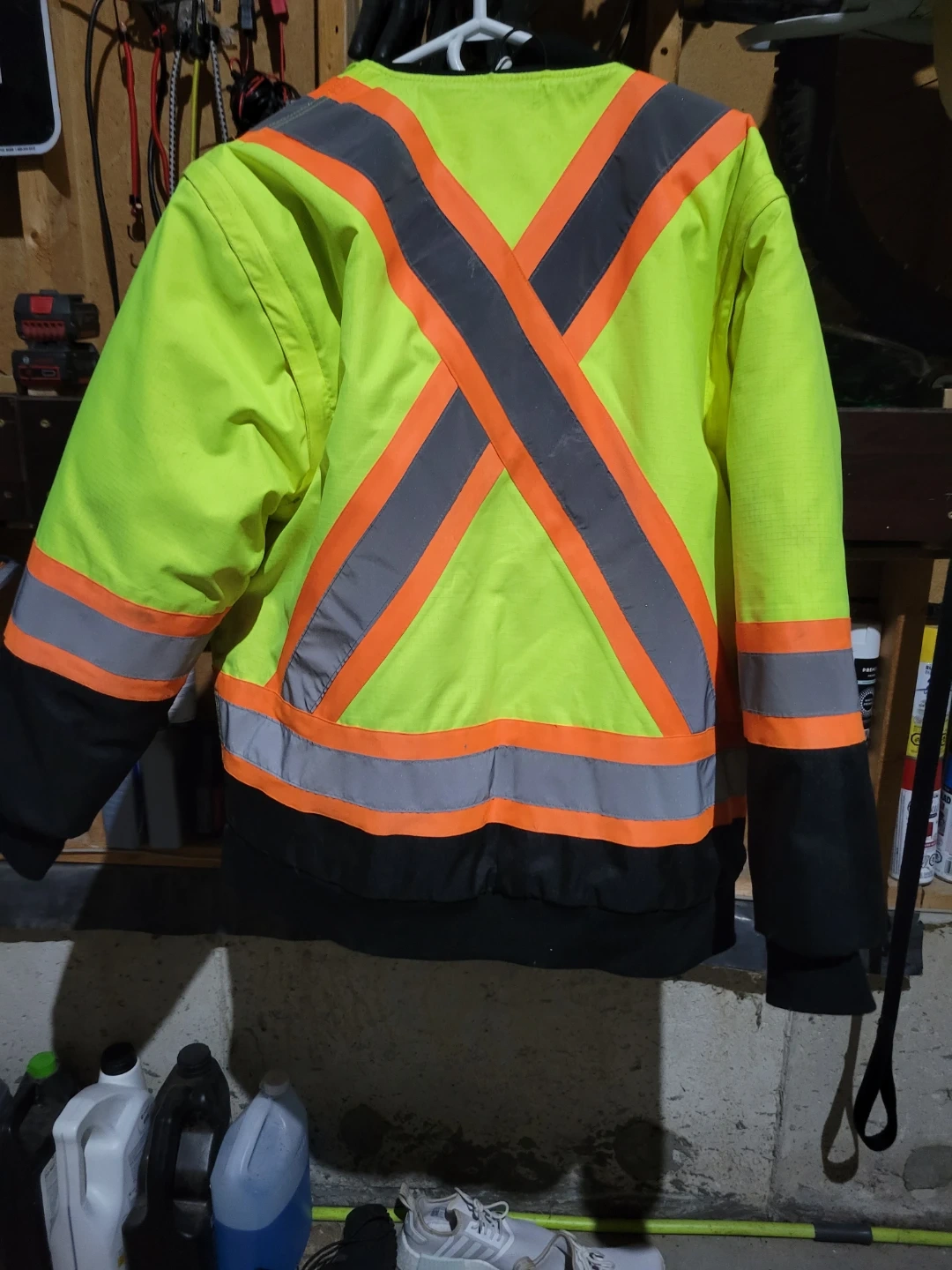 Selling a high visibility safety jacket. It's in great shape and ready to keep you safe on the job site or during outdoor activities. The jacket features reflective stripes for enhanced visibility, making it ideal for low-light conditions. It's a durable and reliable piece of outerwear for any safety-conscious individual