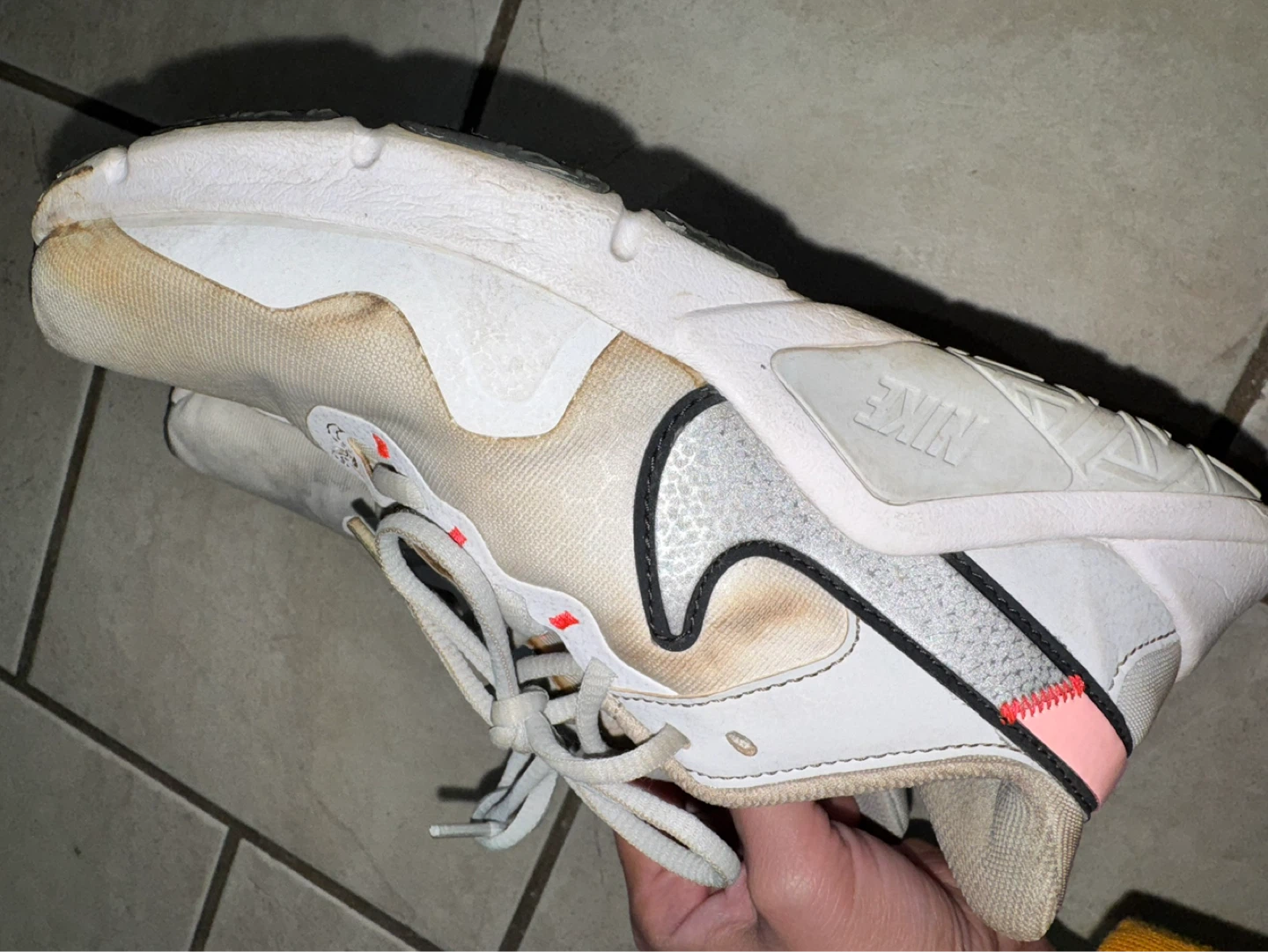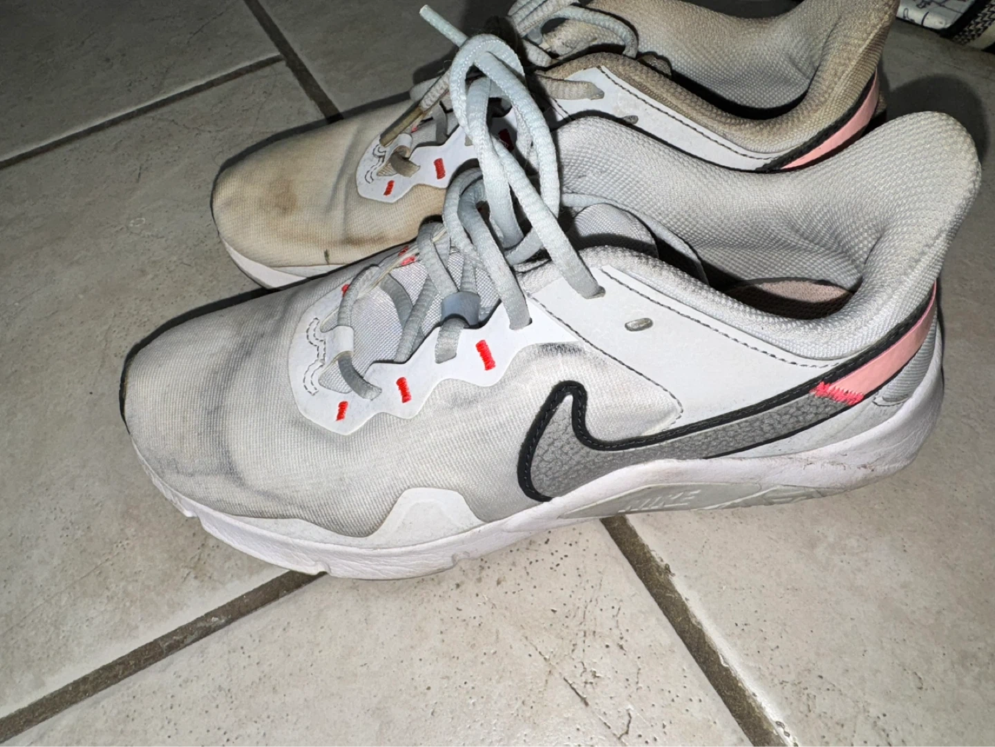 Pair of Nike women's athletic shoes. White with grey and pink accents. Laces included.