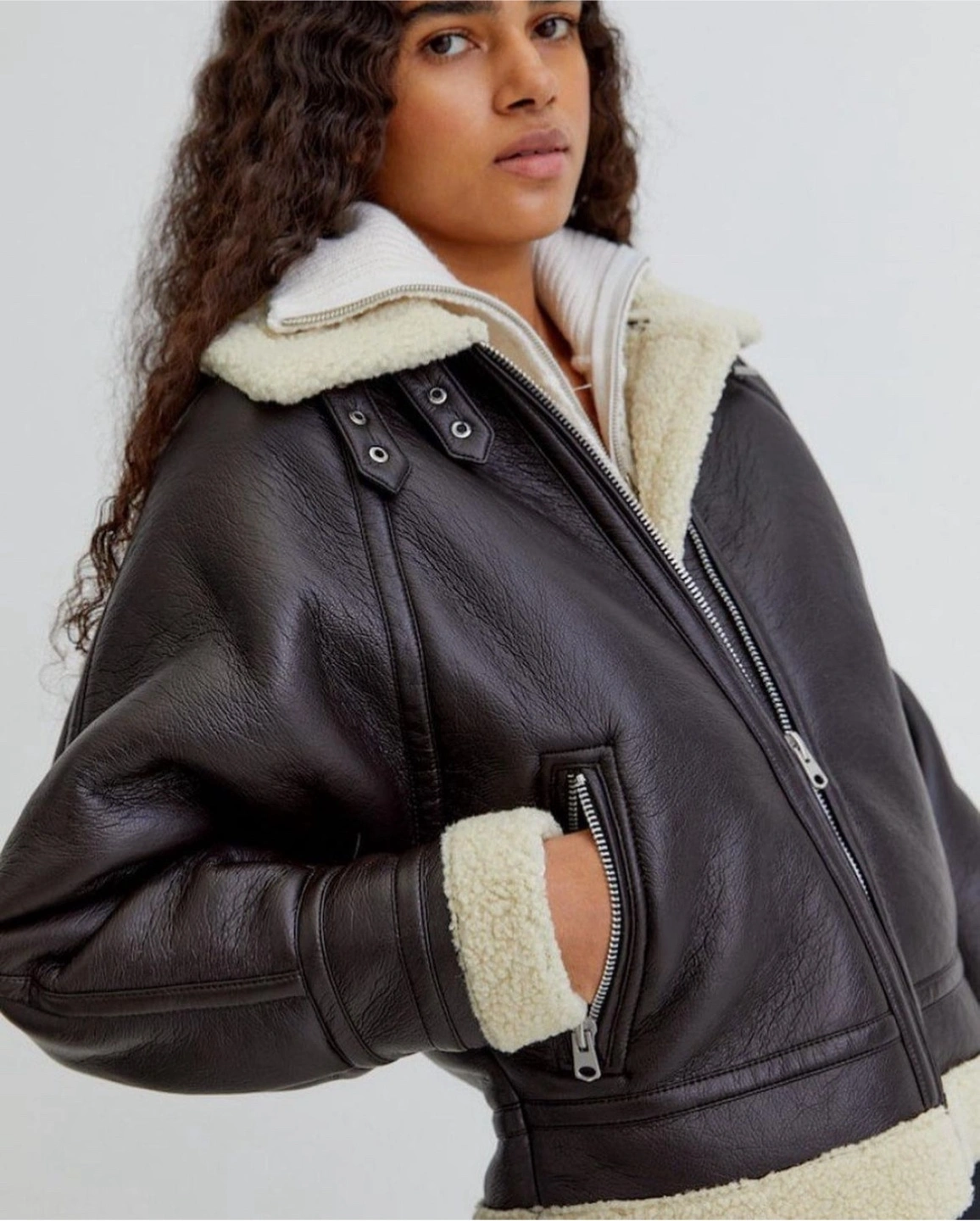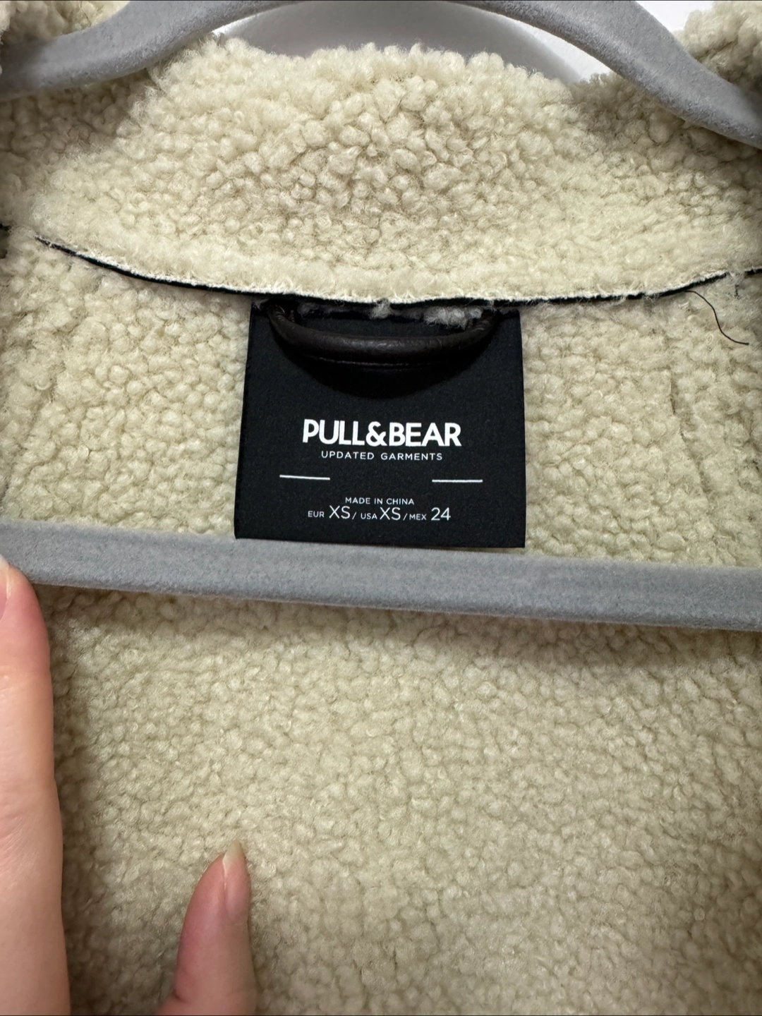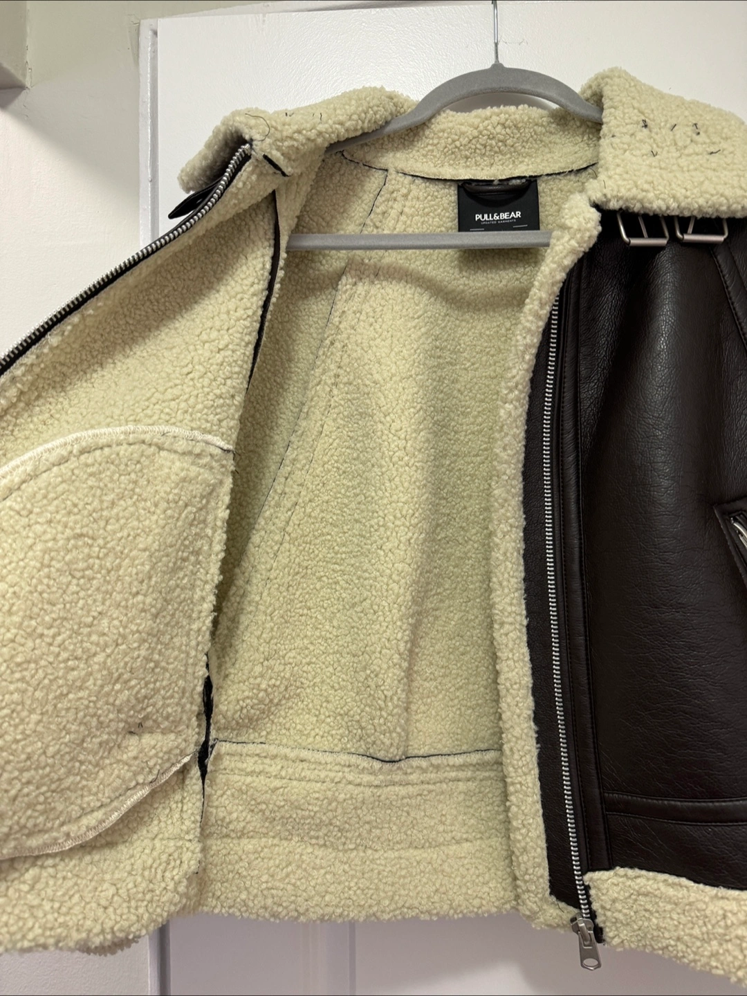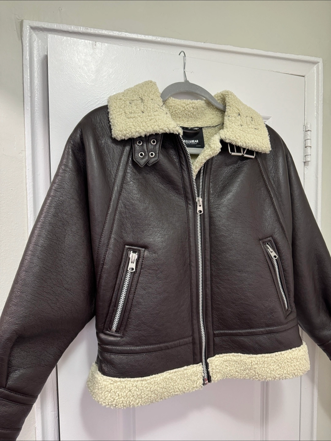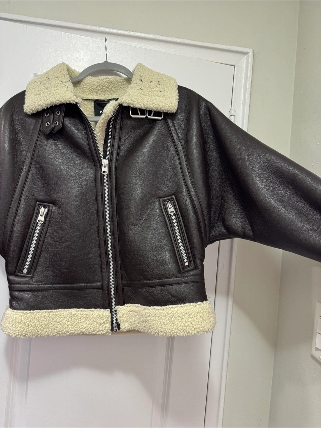 Brown faux leather aviator jacket. Features a cream sherpa lining, zip closure, and multiple pockets. Size XS. I took off the tag but never wore it :(
