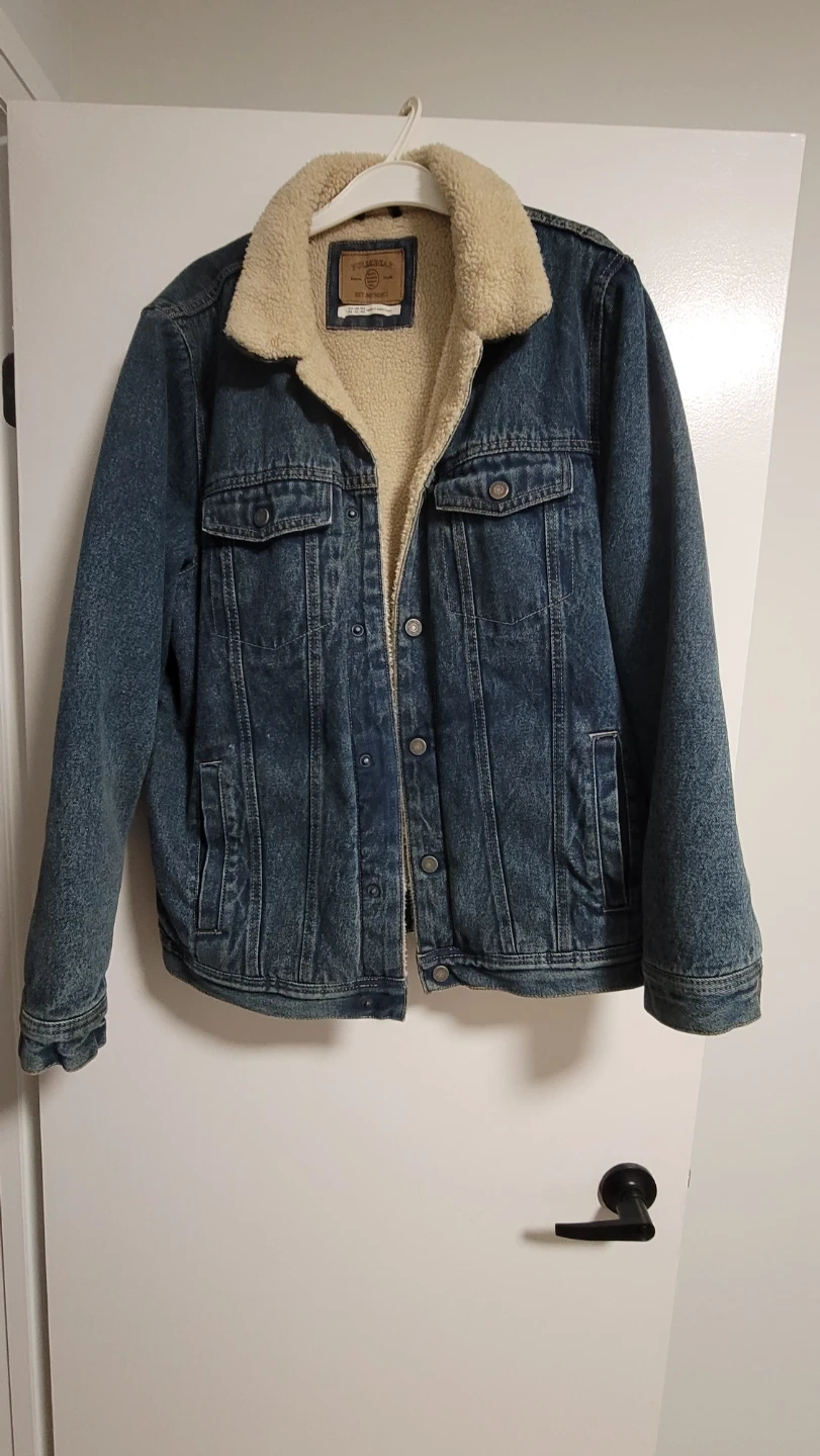 10Selling a Pull&Bear denim jacket in size XL. It features a sherpa lining and collar, perfect for cooler weather. The jacket is in great condition and ready for a new home! LIKE NEW