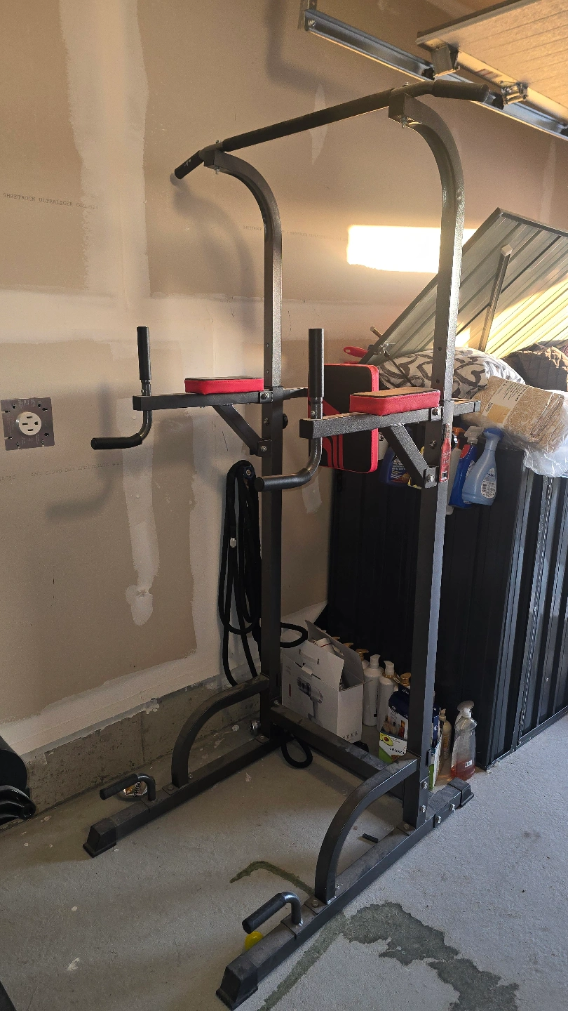 93Home gym pull-up and dip station. Durable steel frame. Red padded handles. Good condition.