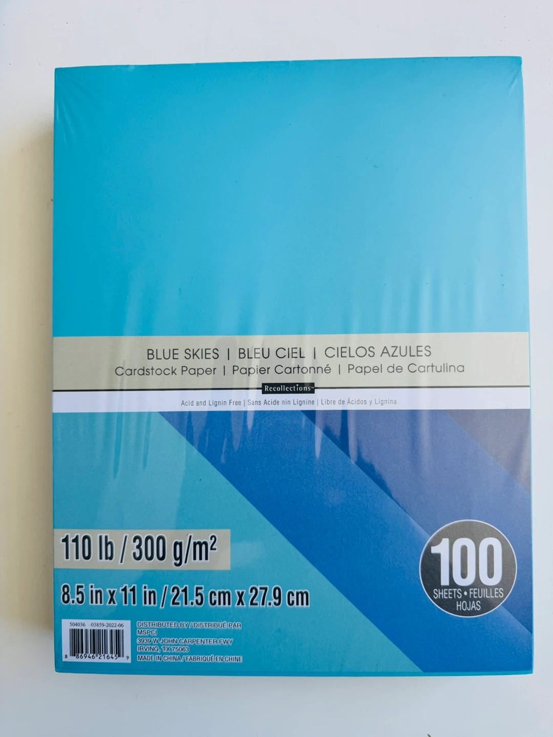 Recollections cardstock paper in Blue Skies. It's 110 lb / 300 g/m² and measures 8.5 x 11 inches. The pack contains 100 sheets and is acid and lignin free. This paper is great for crafts and scrapbooking projects.