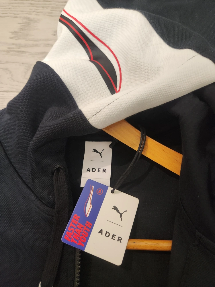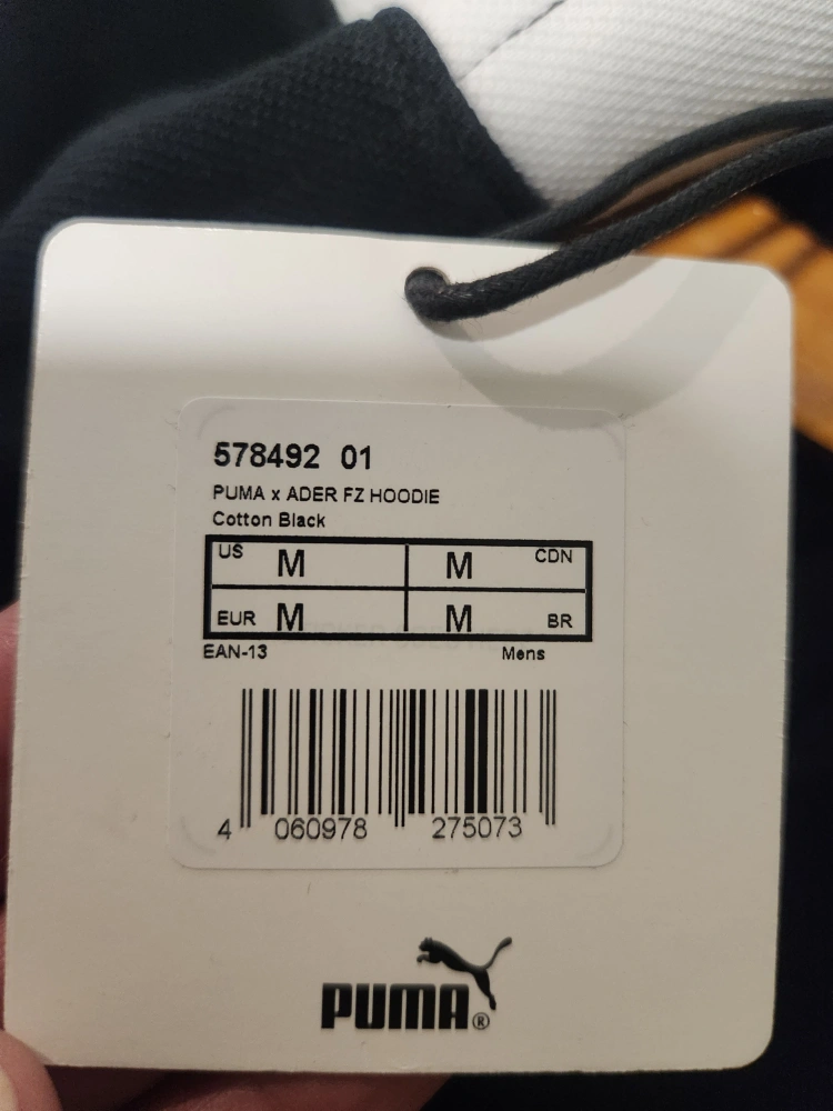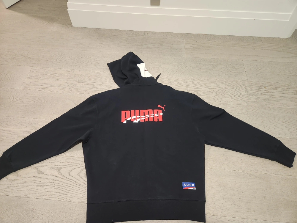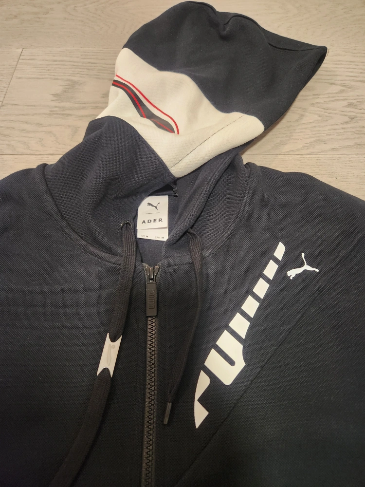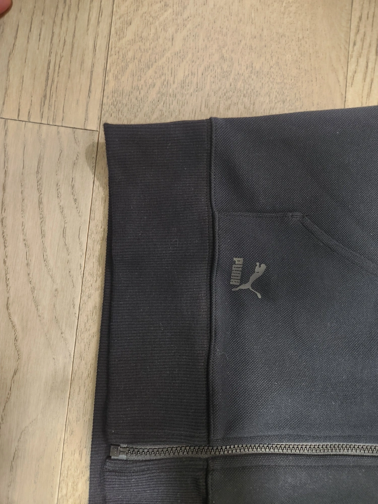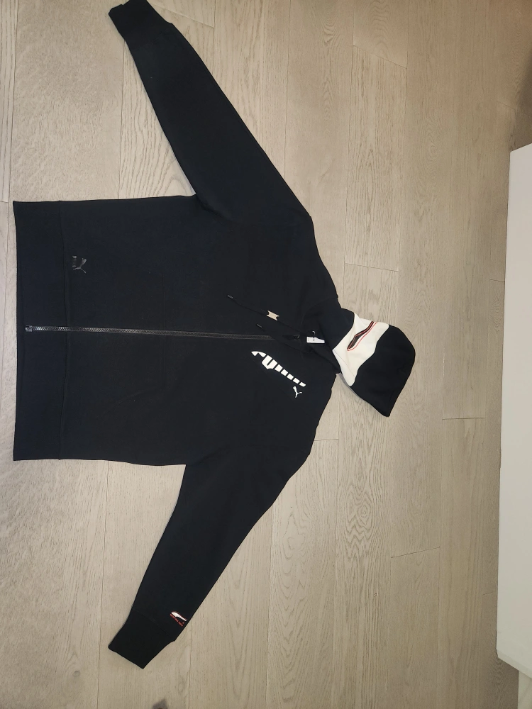 Men's black zip-up hoodie. Features a unique hood design and Puma branding throughout. Brand New. Size M.