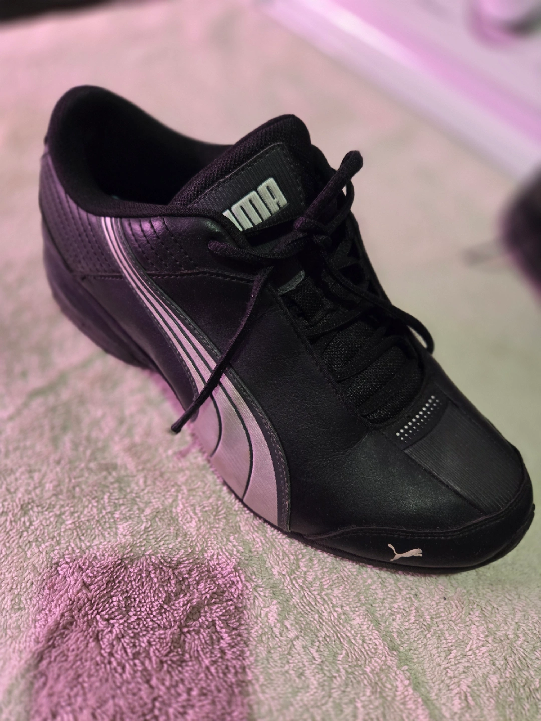 20Selling a pair of Puma sneakers in black leather! They feature a sleek design with silver accents. Perfect for everyday wear or light athletic activities. The soles show some signs of wear, but overall they're in good condition and ready for a new home