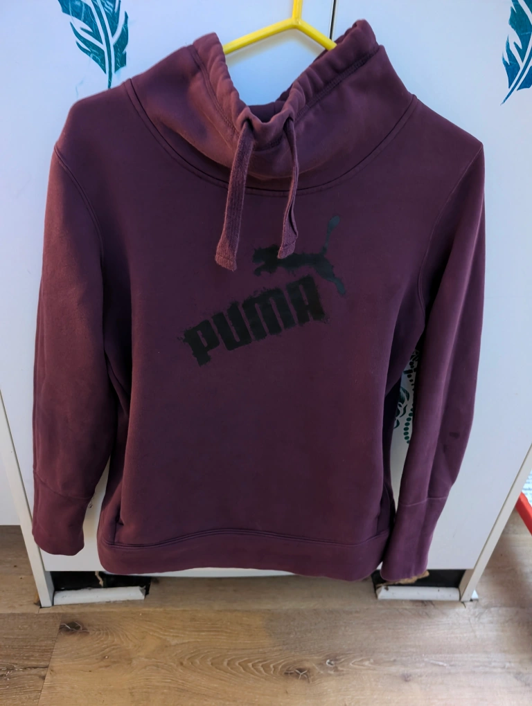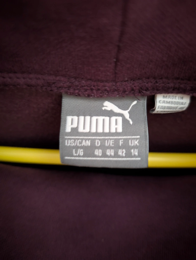 Cozy Puma hoodie in a lovely burgundy/purple colour! It's a size large and features the classic Puma logo. Perfect for staying warm and stylish on chilly days