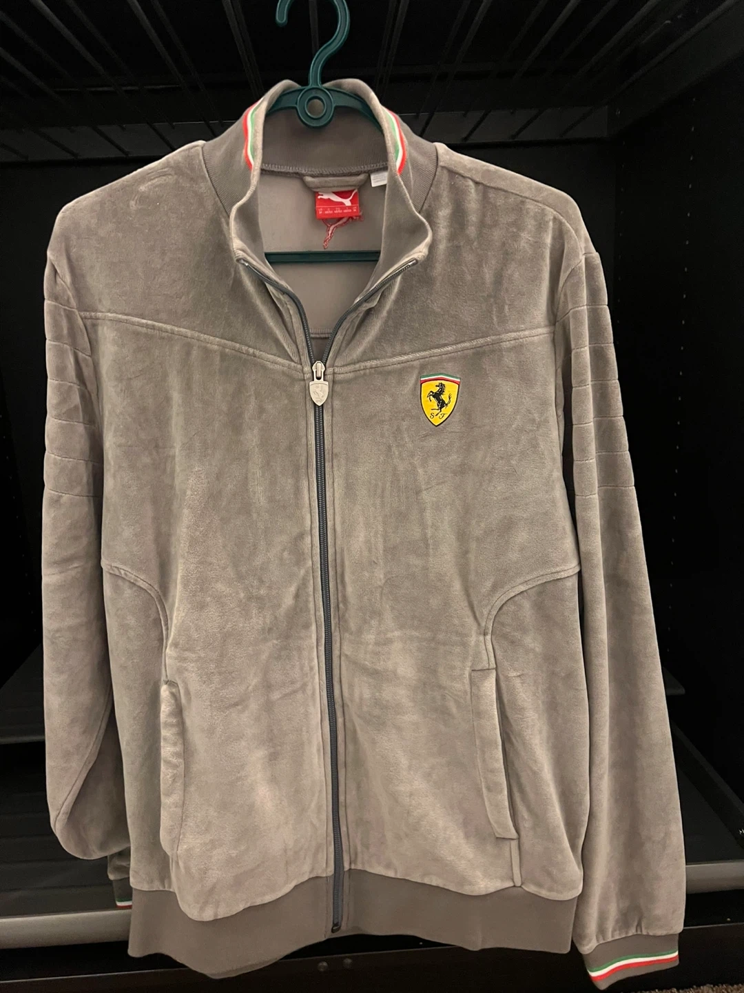 Selling a Puma Ferrari jacket in a nice grey colour! It's in great condition and features the Ferrari logo. Perfect for any fan!