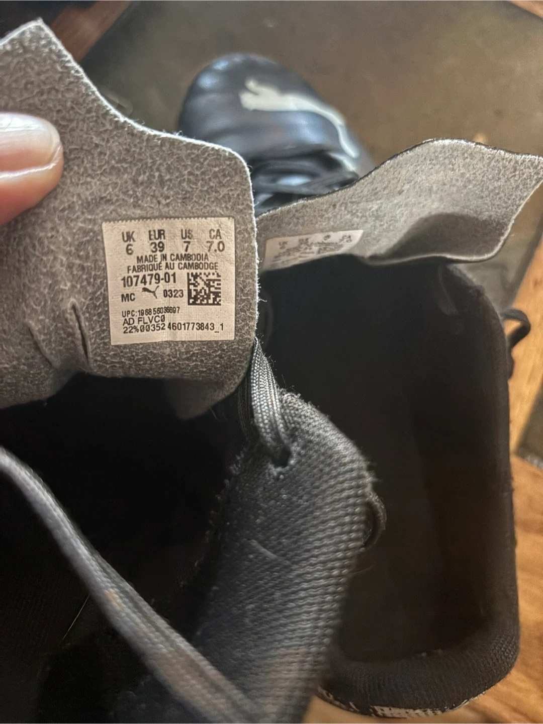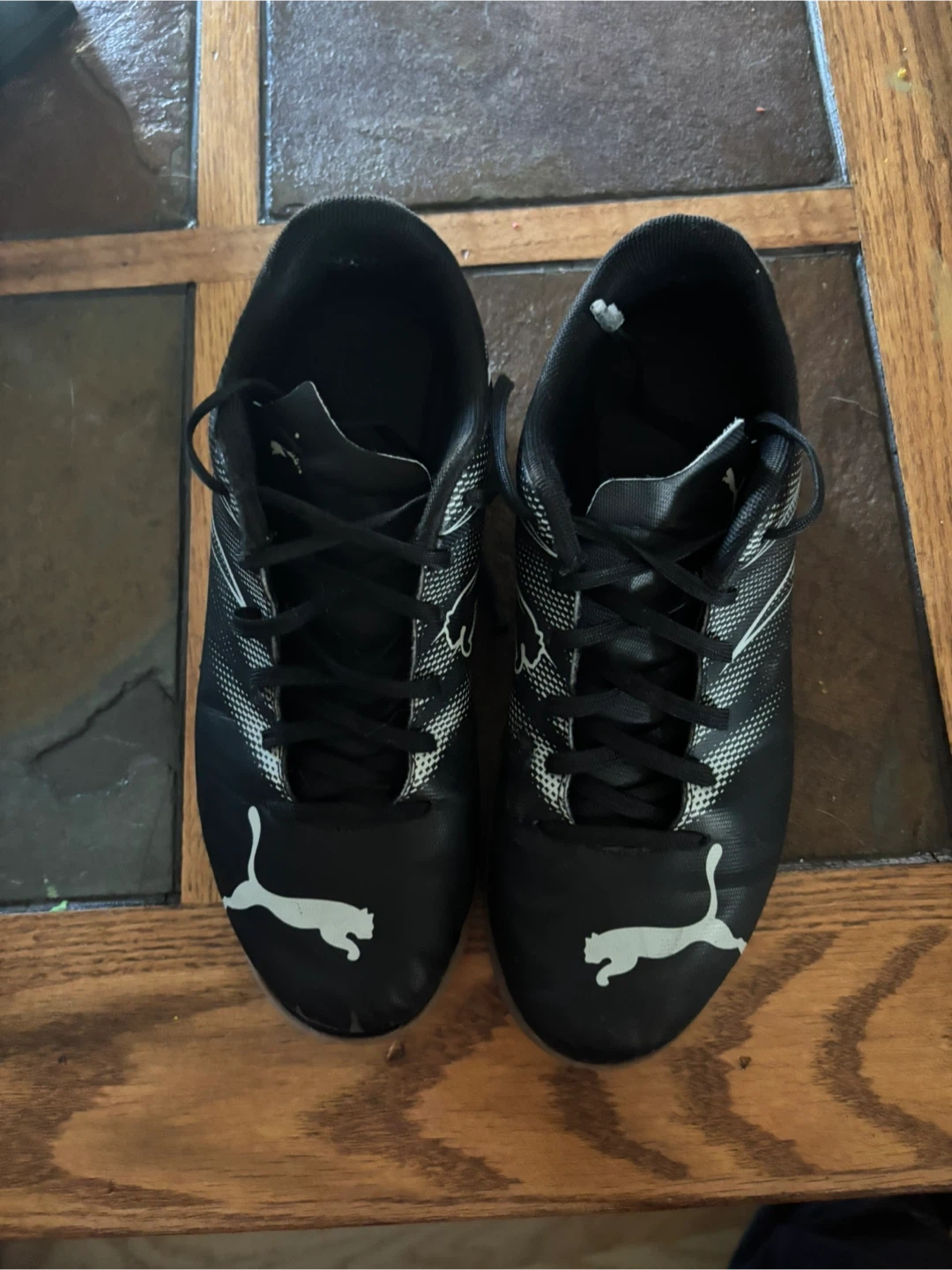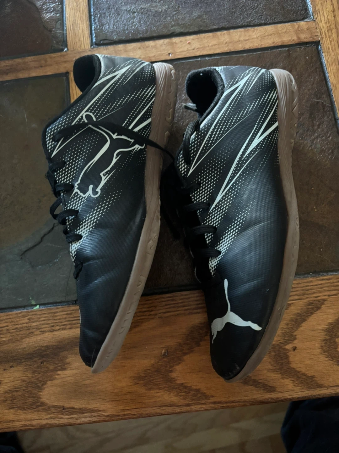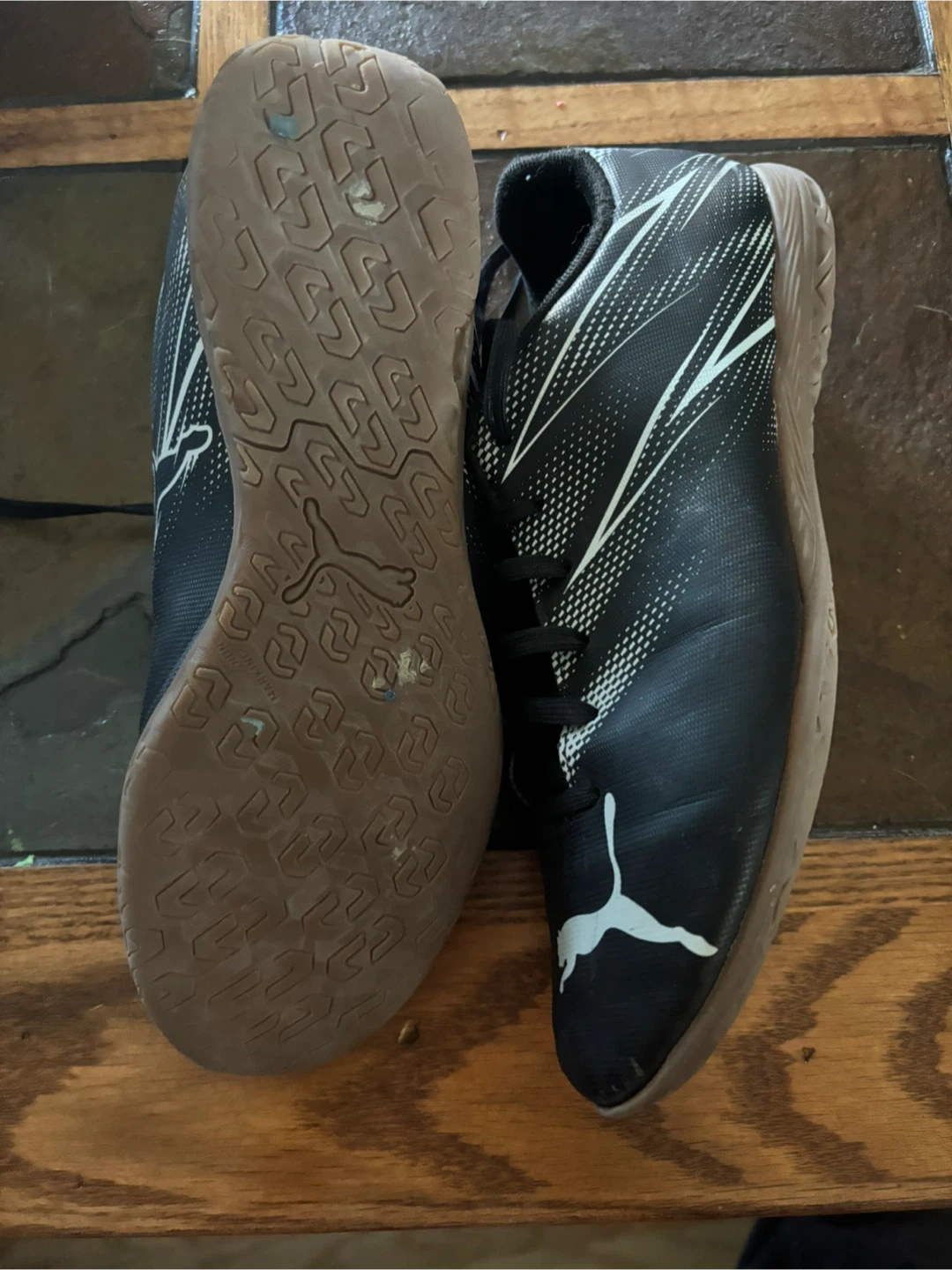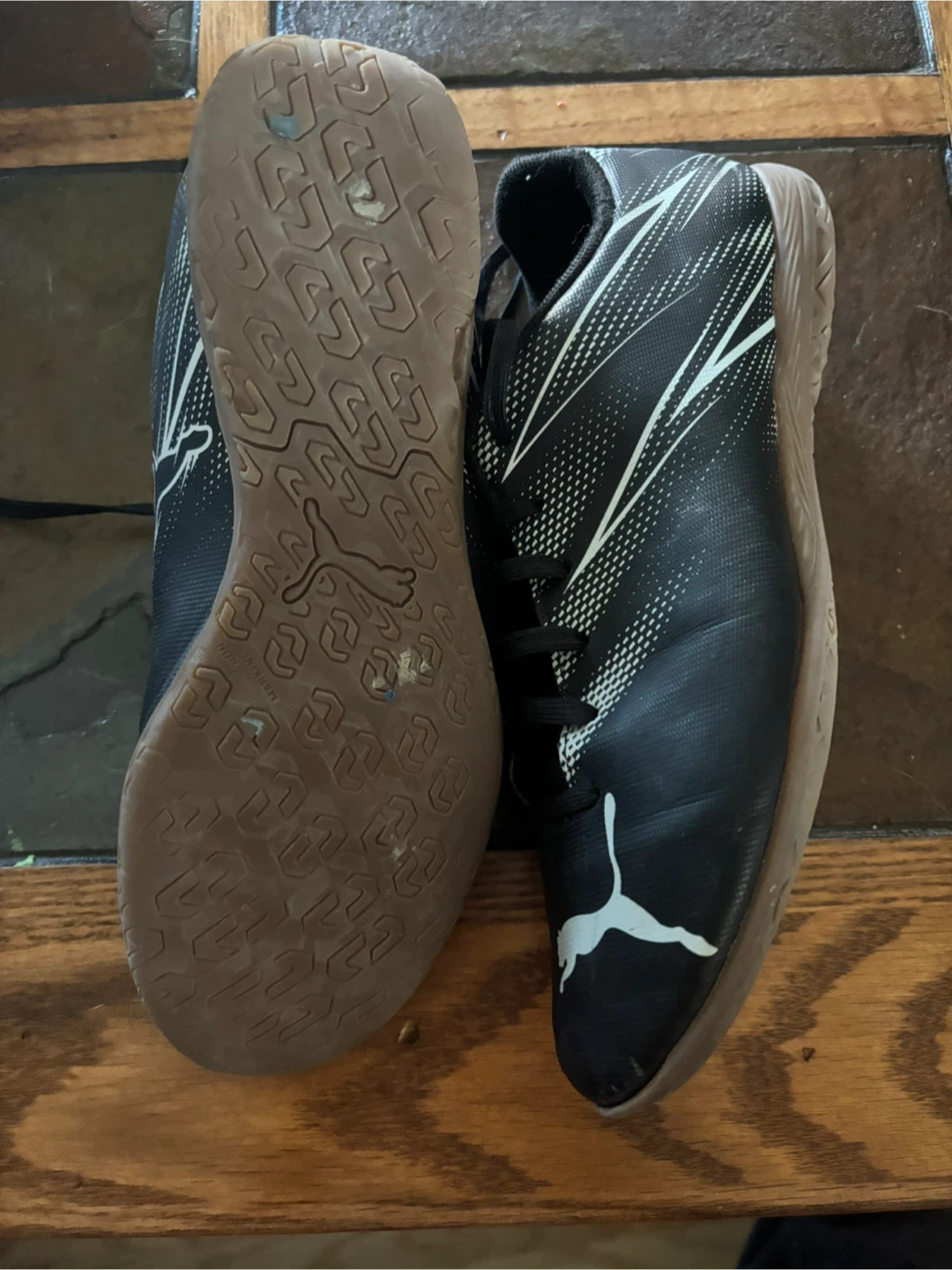 10Selling a pair of Puma indoor soccer shoes. black with white accents and in used condition. The size is US 7.
