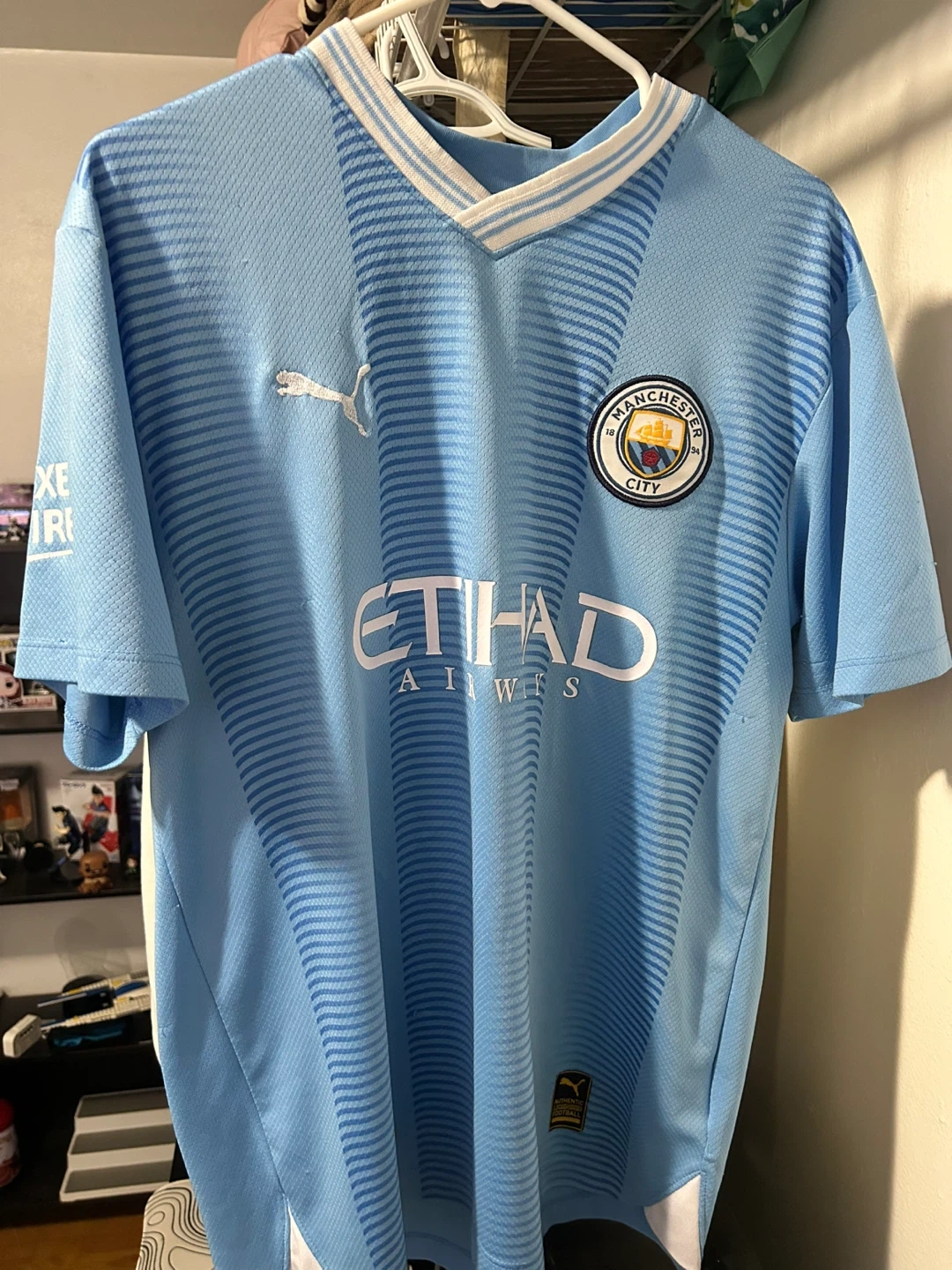 Selling a Manchester City jersey with Haaland's name and number 9 on the back! The jersey is a light blue colour, and made by Puma. It also features the Etihad logo on the front. A great jersey for any Man City fan! The number is cracking a bit