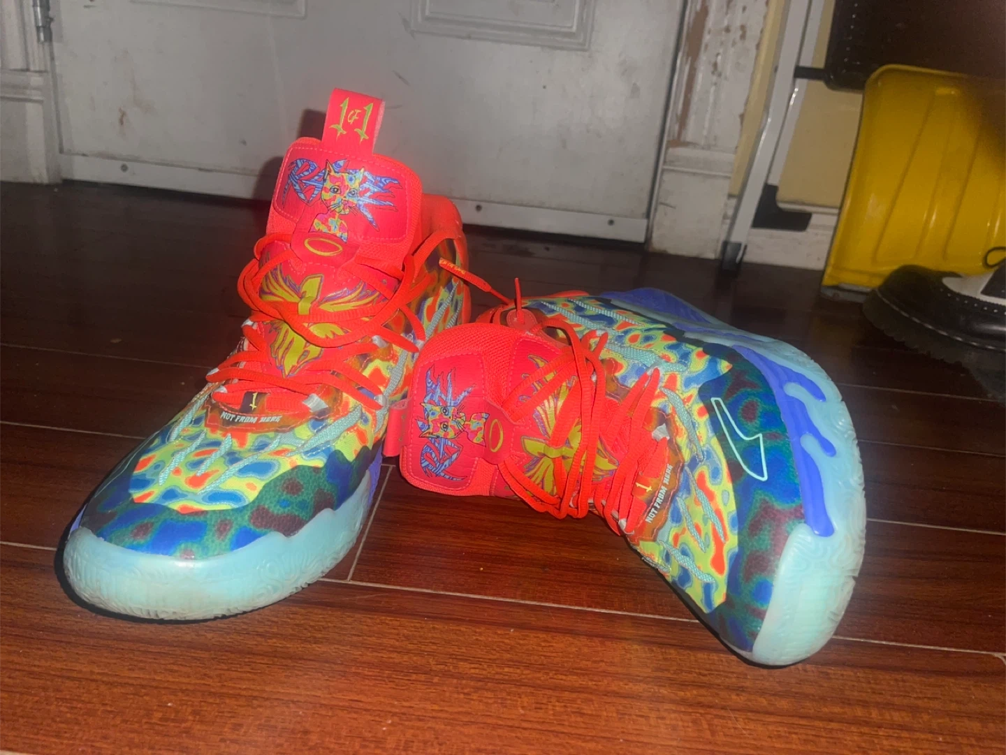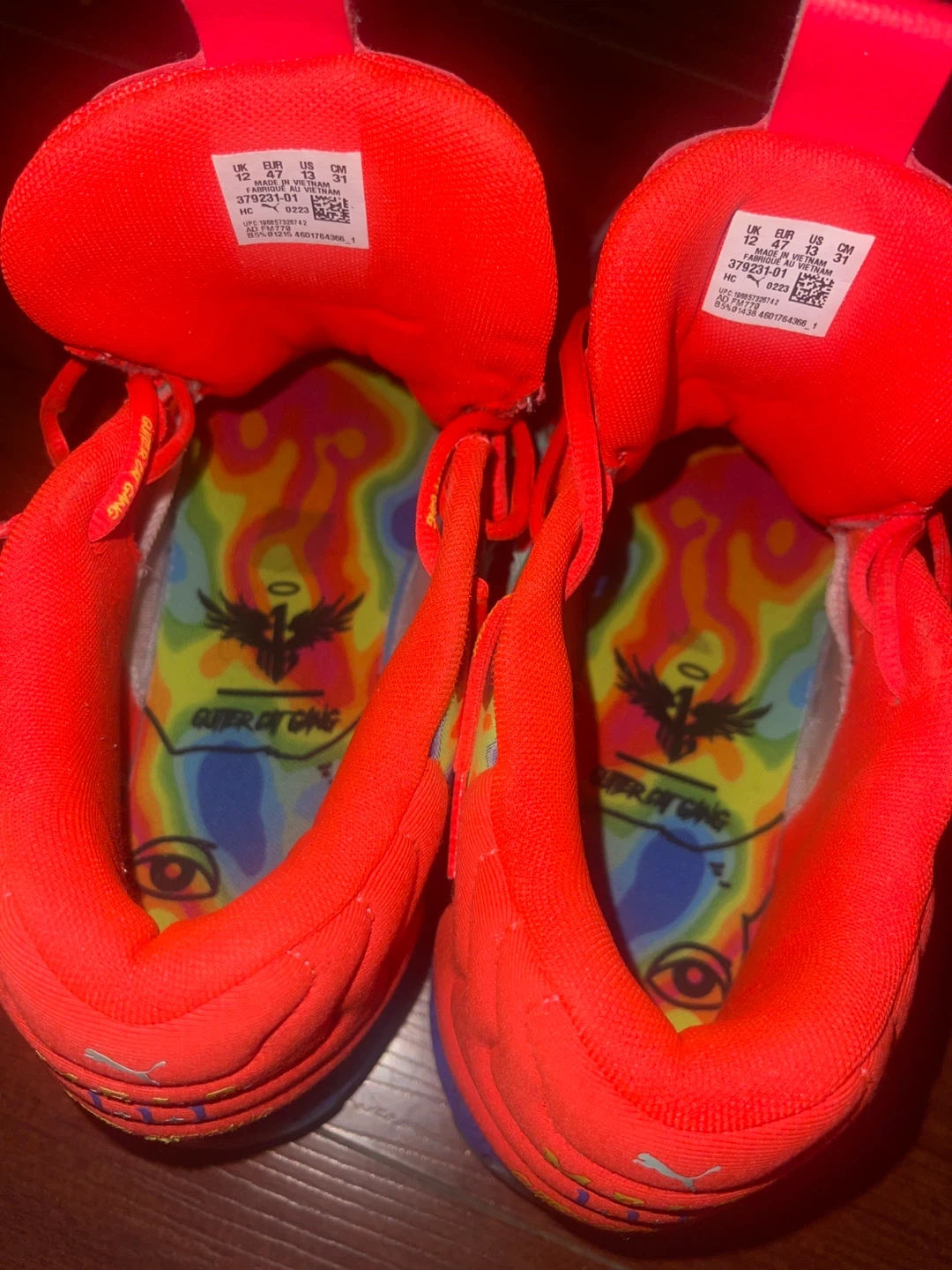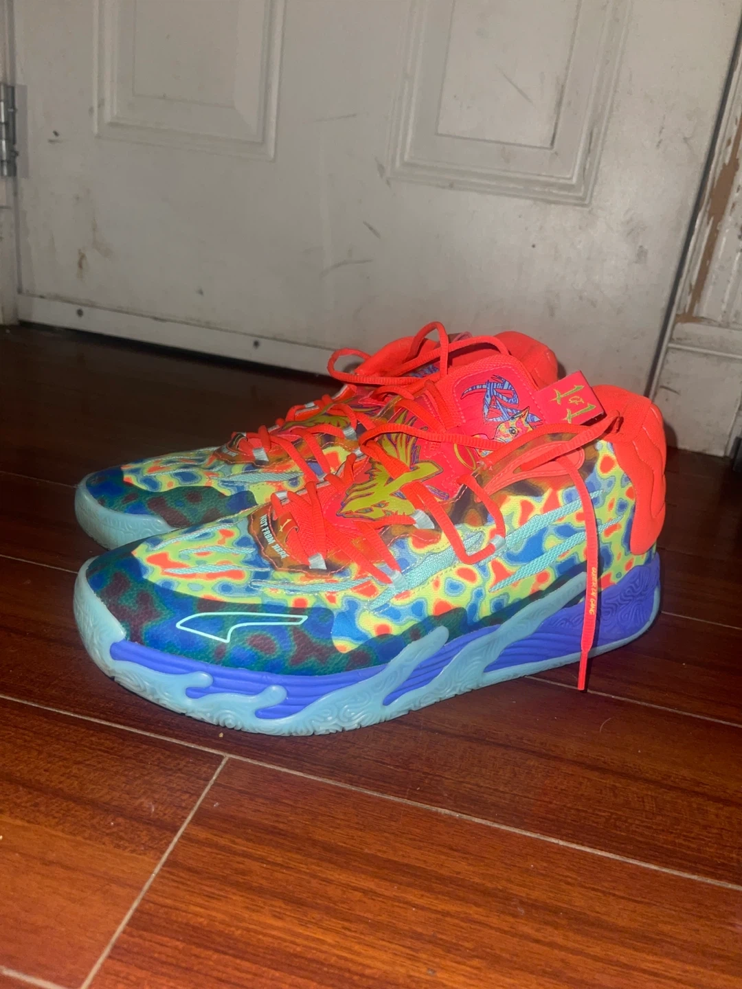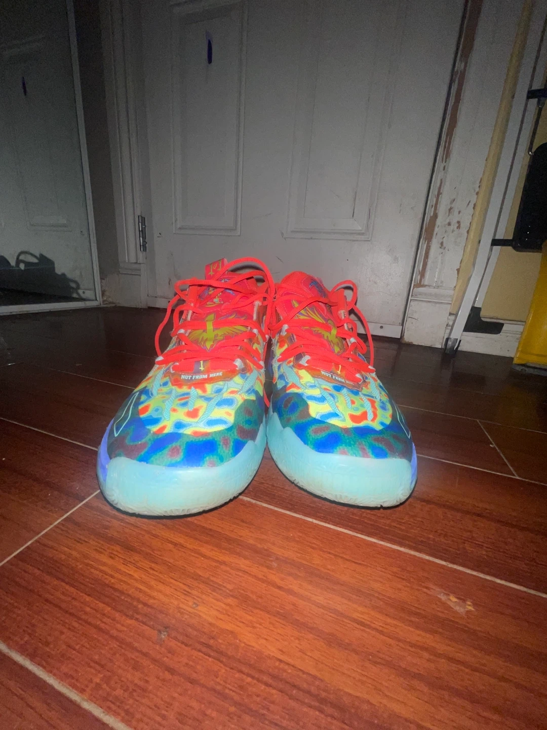 76Selling a pair of Puma MB.01 Lo UFO high-top sneakers in US size 12 They feature a unique and vibrant design. Please see photos for condition. I wore them once for a outdoor game and haven’t wore them since