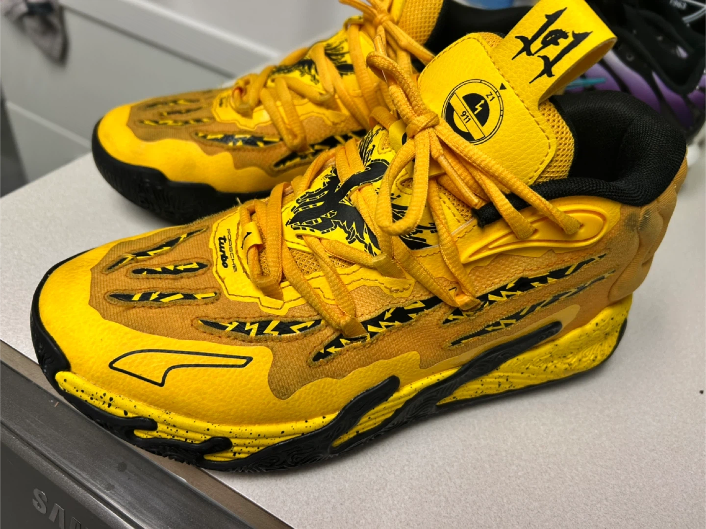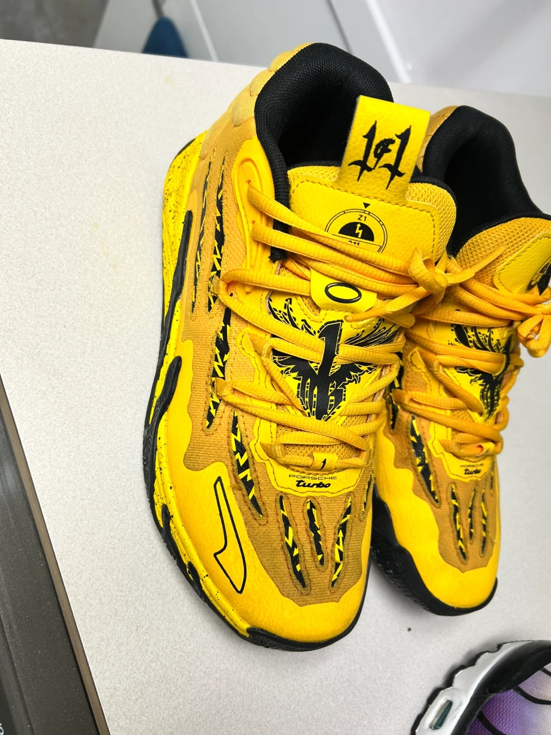 10Check out these Puma Melo Porsche Turbo sneakers! They're a vibrant yellow colour and feature a unique design.
