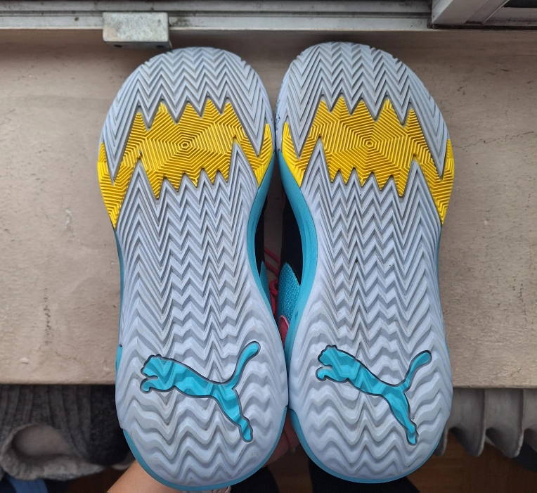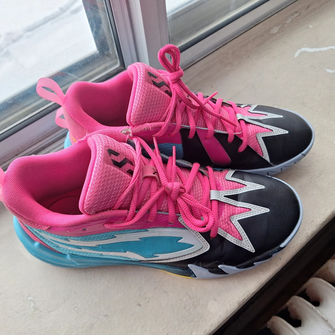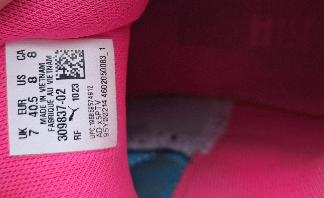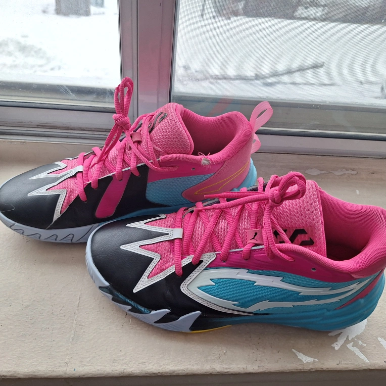 527Pre-owned Puma Men's basketball shoes. Size 8. Pink, black, and teal colour scheme. Minor wear and tear visible. Some small pulls on the inner fabric. Great for the court or casual wear. Only wore indoor for basketball. my son has outgrown them. Just under a year old.
