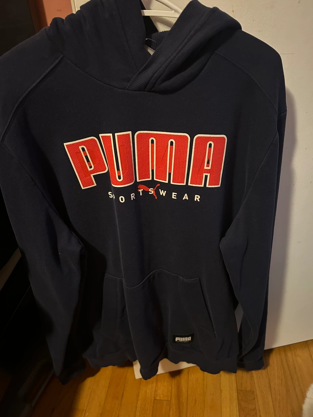 Selling a comfy Puma hoodie in navy blue! It features the classic Puma logo across the chest. Perfect for staying warm and stylish. Check it out!