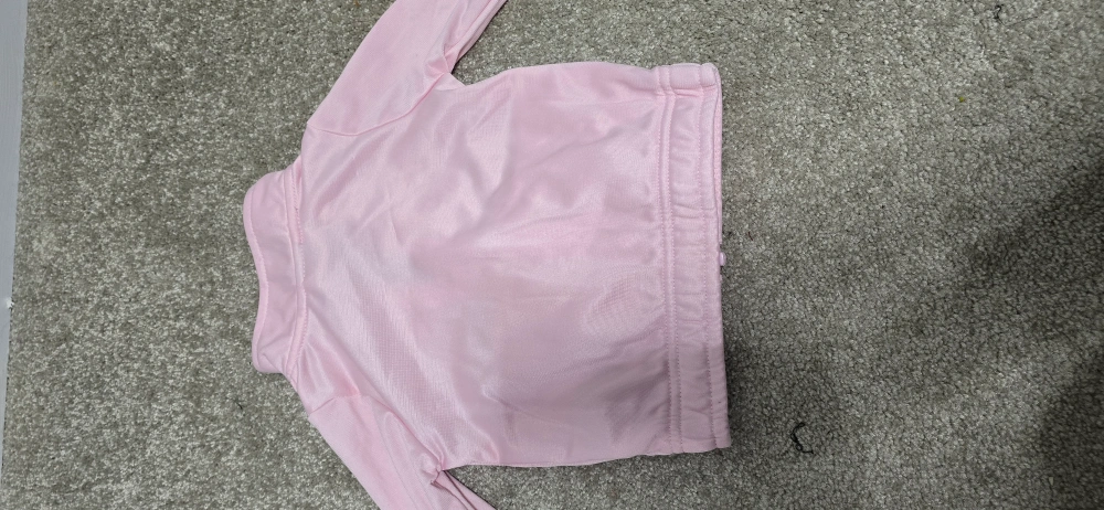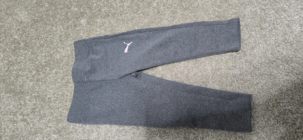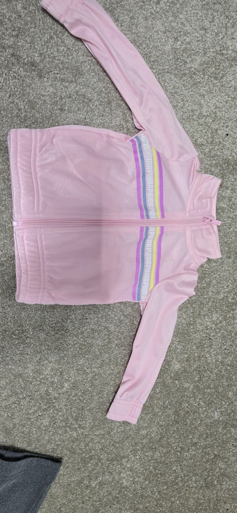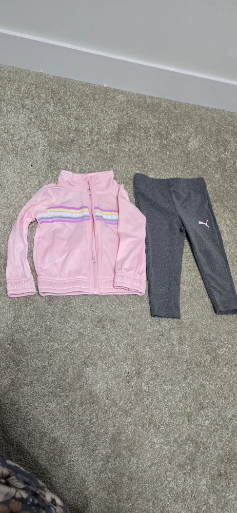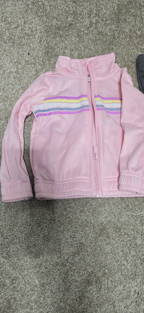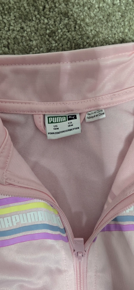 A cute and sporty Puma tracksuit for your little one! This set includes a pink zip-up jacket with colourful stripes and grey pants. The size is 18 months. Perfect for keeping your baby comfy and stylish!