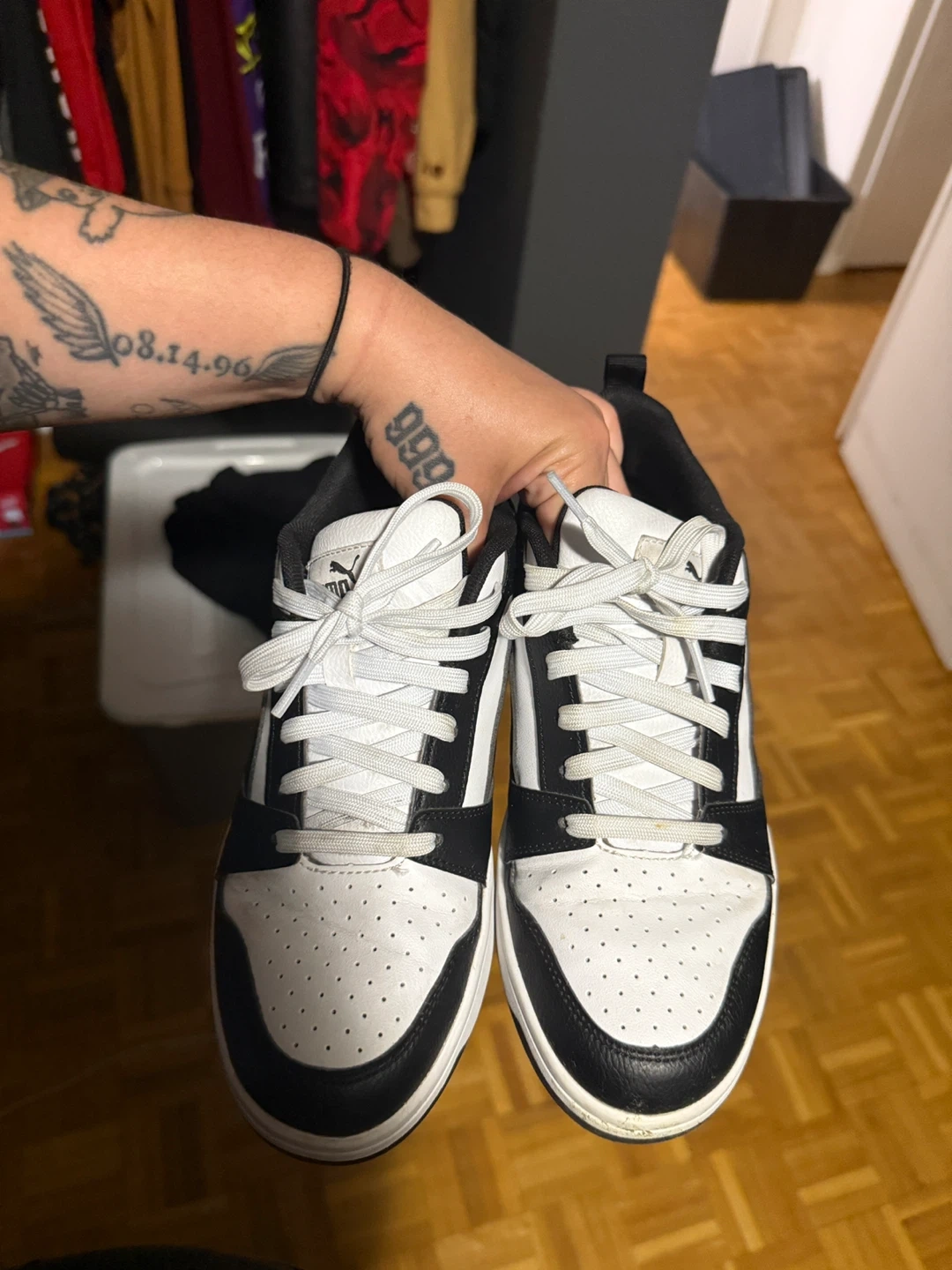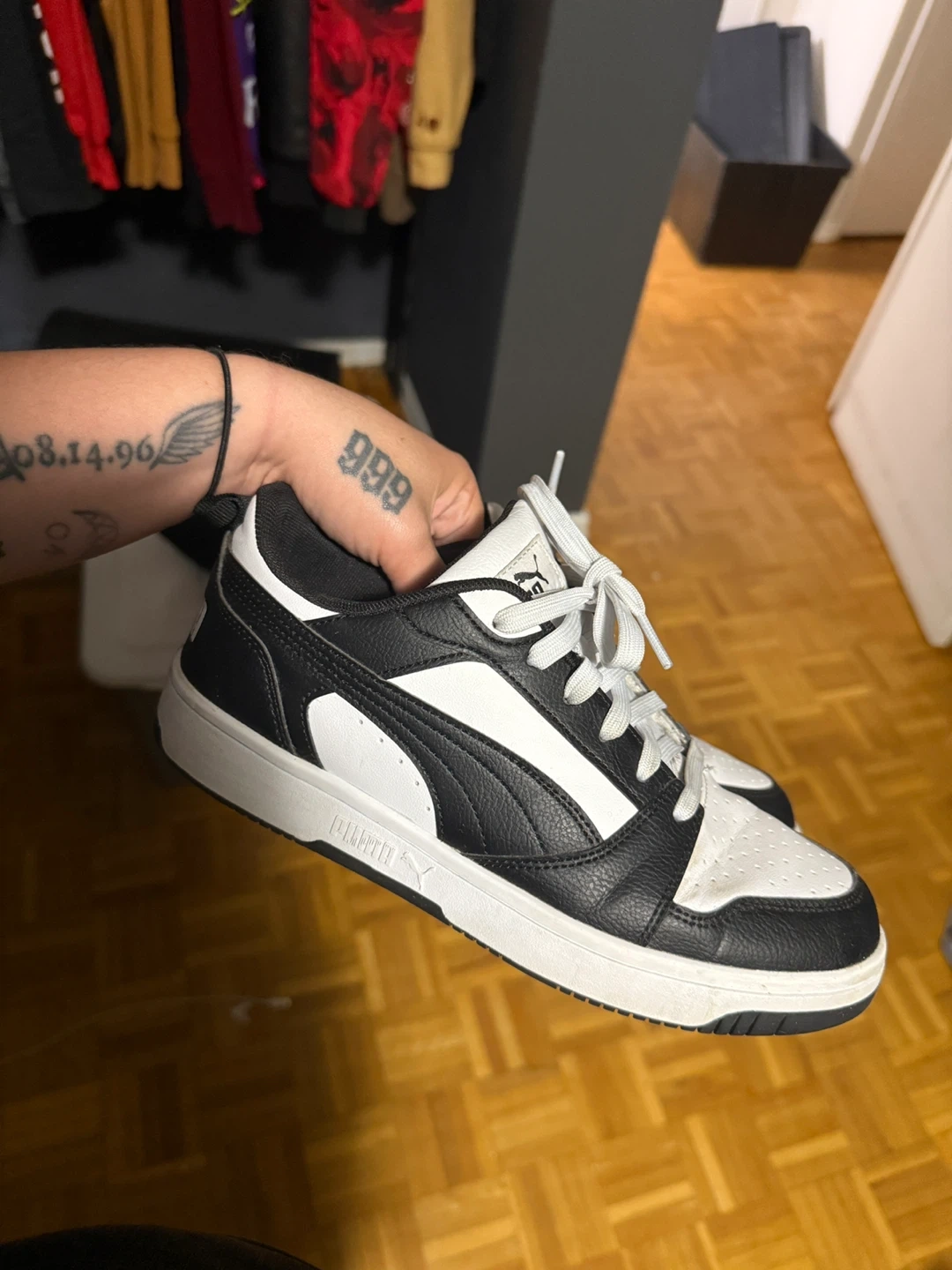 Selling a pair of Puma Rebound Low sneakers in size 7 US. They are in good condition and feature a classic black and white design. Perfect for everyday wear!
