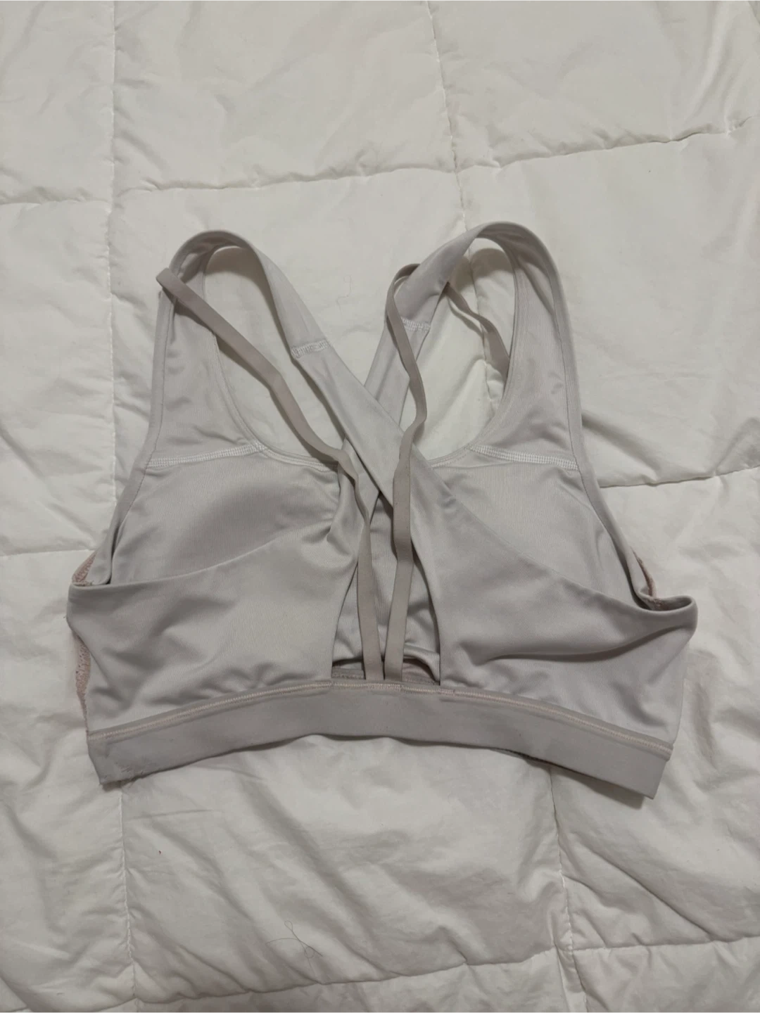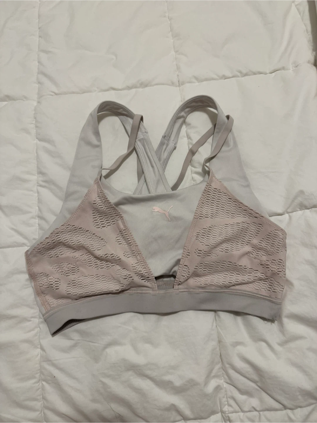 Selling a Puma sports bra in light pink and white! It's in great condition and ready for your next workout. The design features a stylish cross-back.