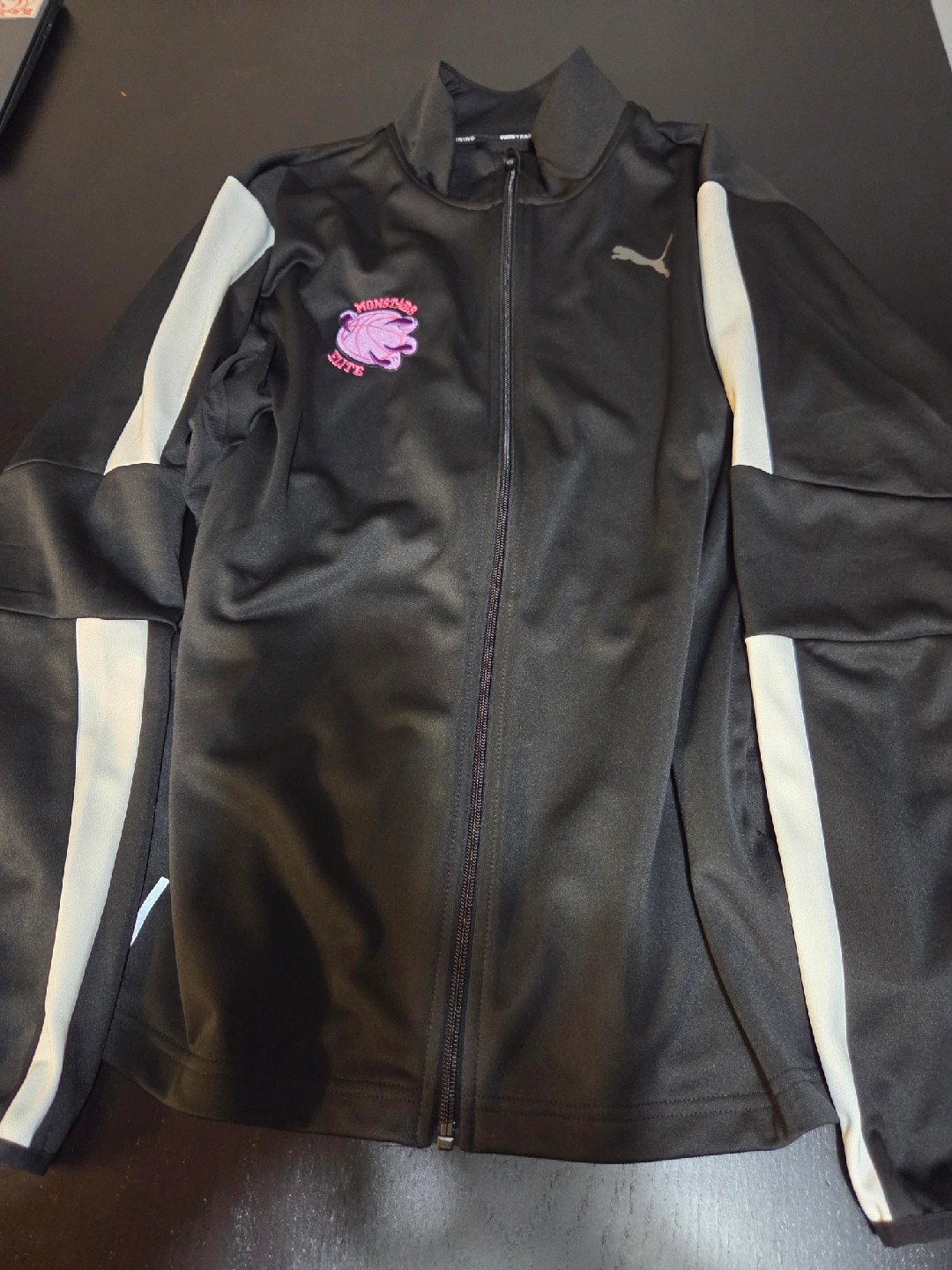 Selling a Puma tracksuit, size L. It's black with a white stripe and has a "Monsters Elite" logo on it. The pants have zippers at the ankles.