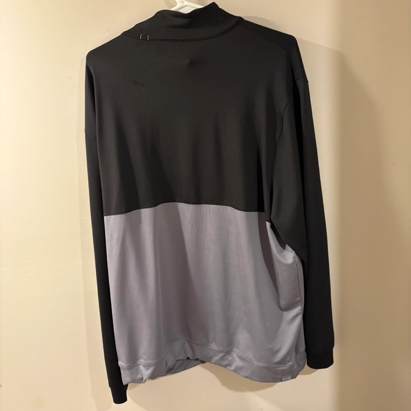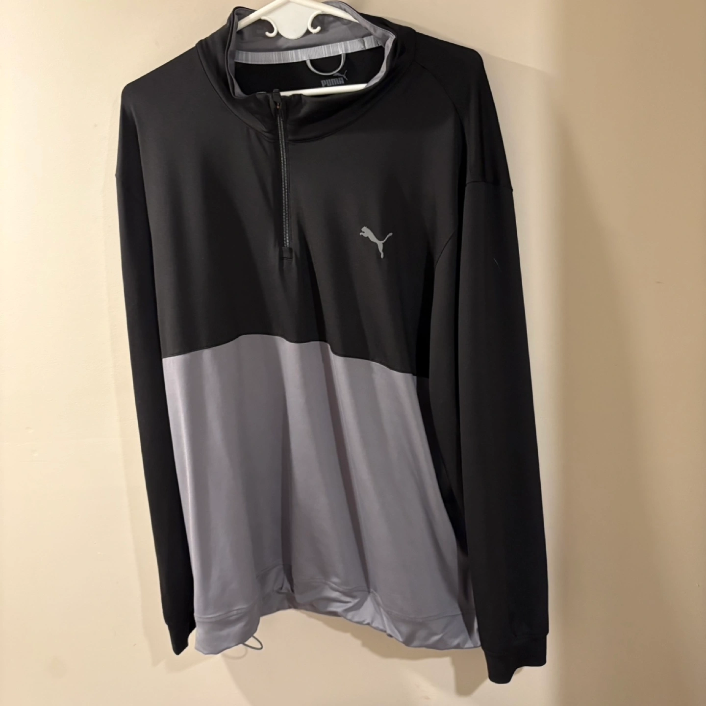 Selling a Puma pullover in size XXL. It's a stylish black and gray colour block design. The material is lightweight and perfect for layering. It's in great condition and ready for a new home!