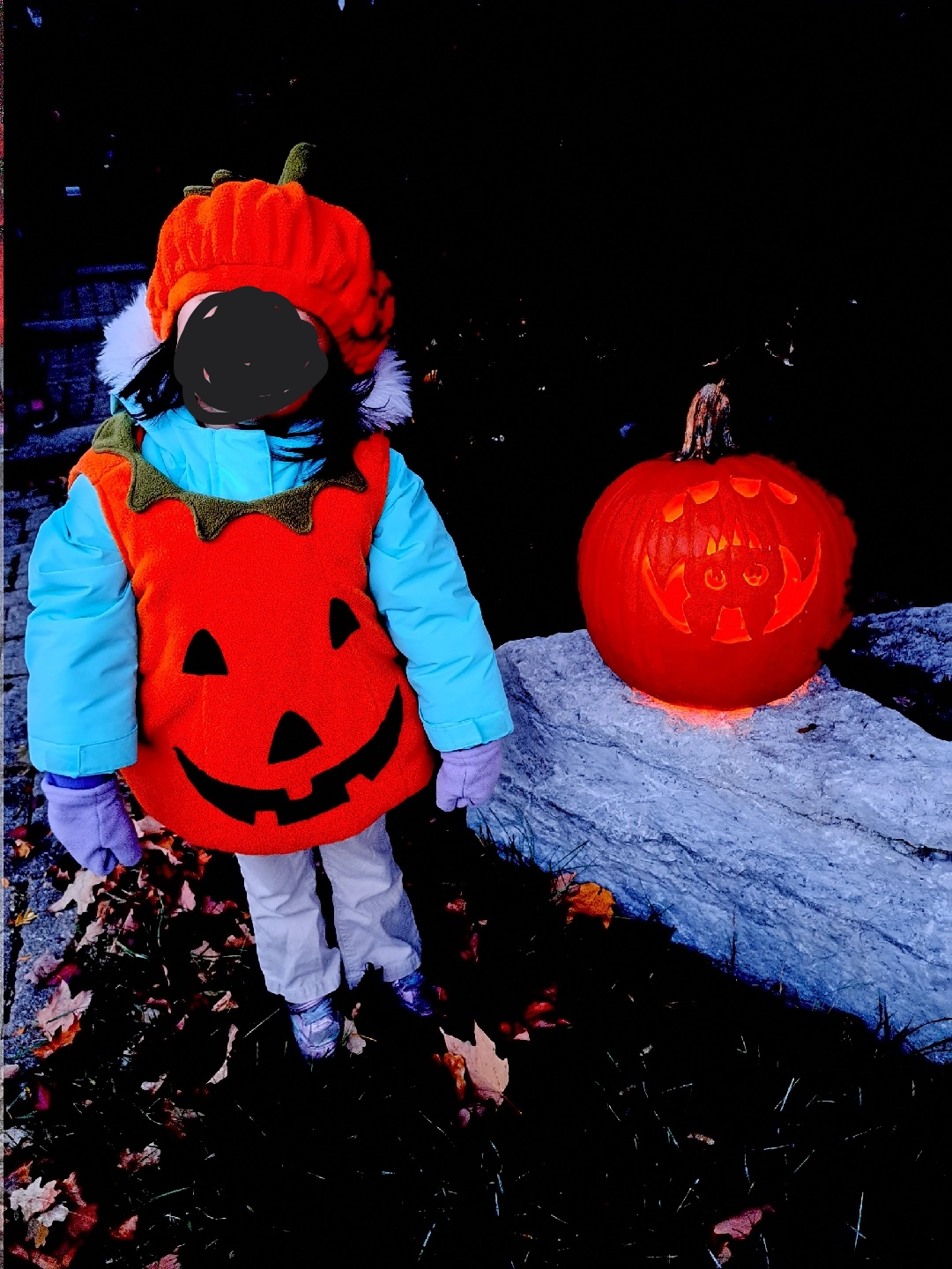 10Cute pumpkin costume with matching hat! Perfect for Halloween or dress-up play. The costume is in great condition and ready for a new home. Should fit for around 18m-4T. Child is wearing a 3T jacket in these pics. Material is fleecey and warm, with some padding/puffiness that would look more 'round' on a smaller child. Pickup Bayview and 407. Cash preferred.