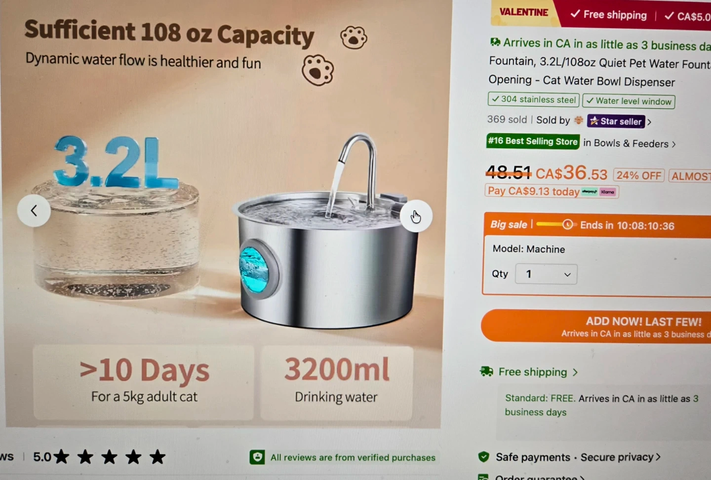 This is a stainless steel pet water fountain with a 3.2L capacity and a round window to see the water level.Stainless steel is so much better than plastic that can be unhealthy for your pet. It features dynamic water flow that's healthier and fun for pets. Includes sensor that I purchased separately, which allows the fountain to turn on and off, 11 filters, that I purchased separately and also cleaning brushes.
