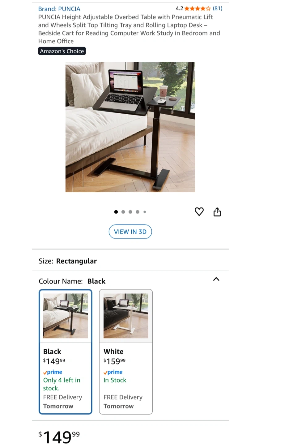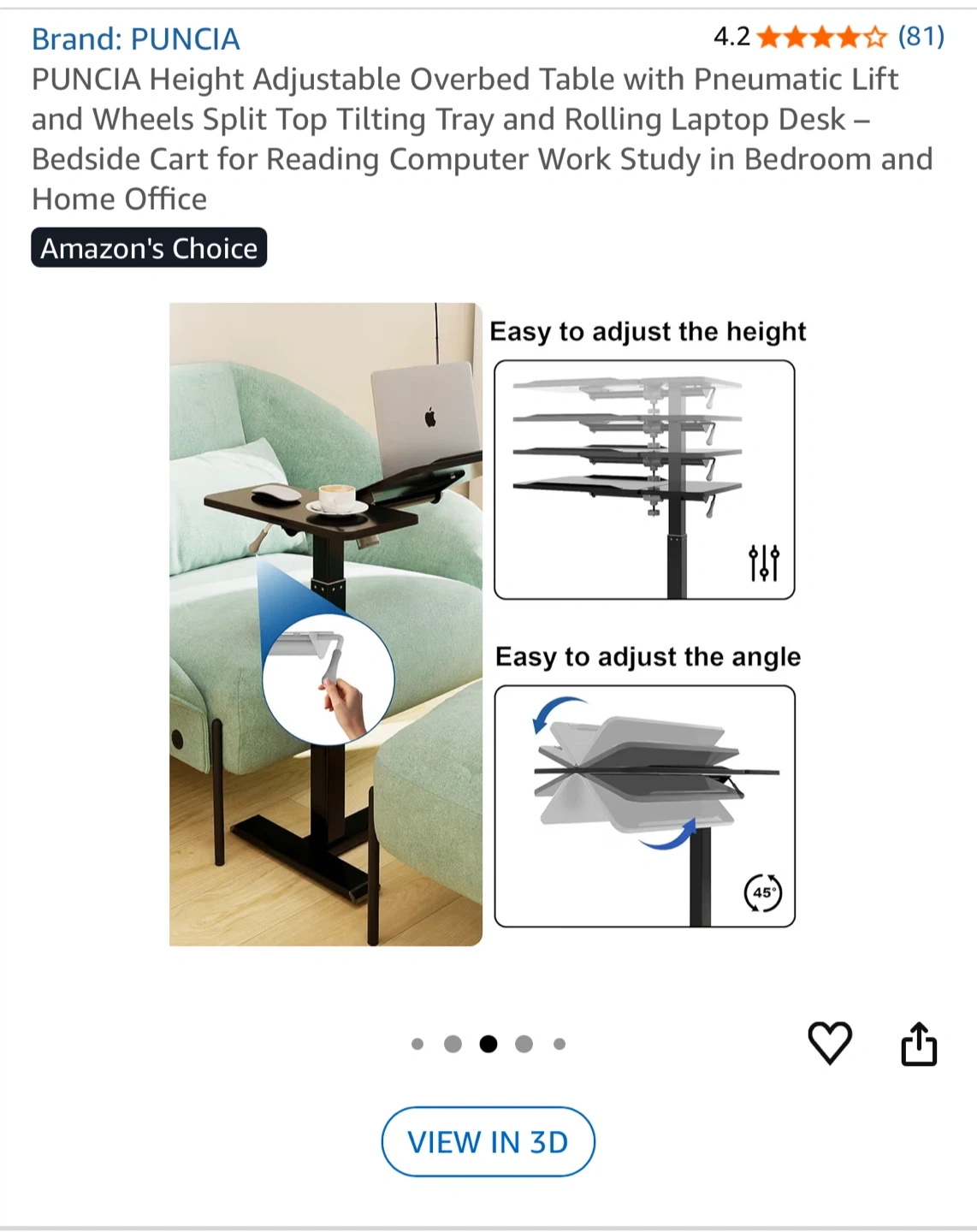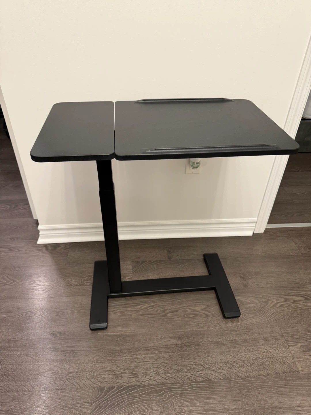 37Selling a Puncia adjustable overbed table in black. It has a pneumatic lift and wheels, making it easy to move around. The top is split and tilting, perfect for using a laptop or reading in bed or at your desk. The height is adjustable from 27 to 40 inches. Mint condition. Have been in use a month while was disabled due back problem.