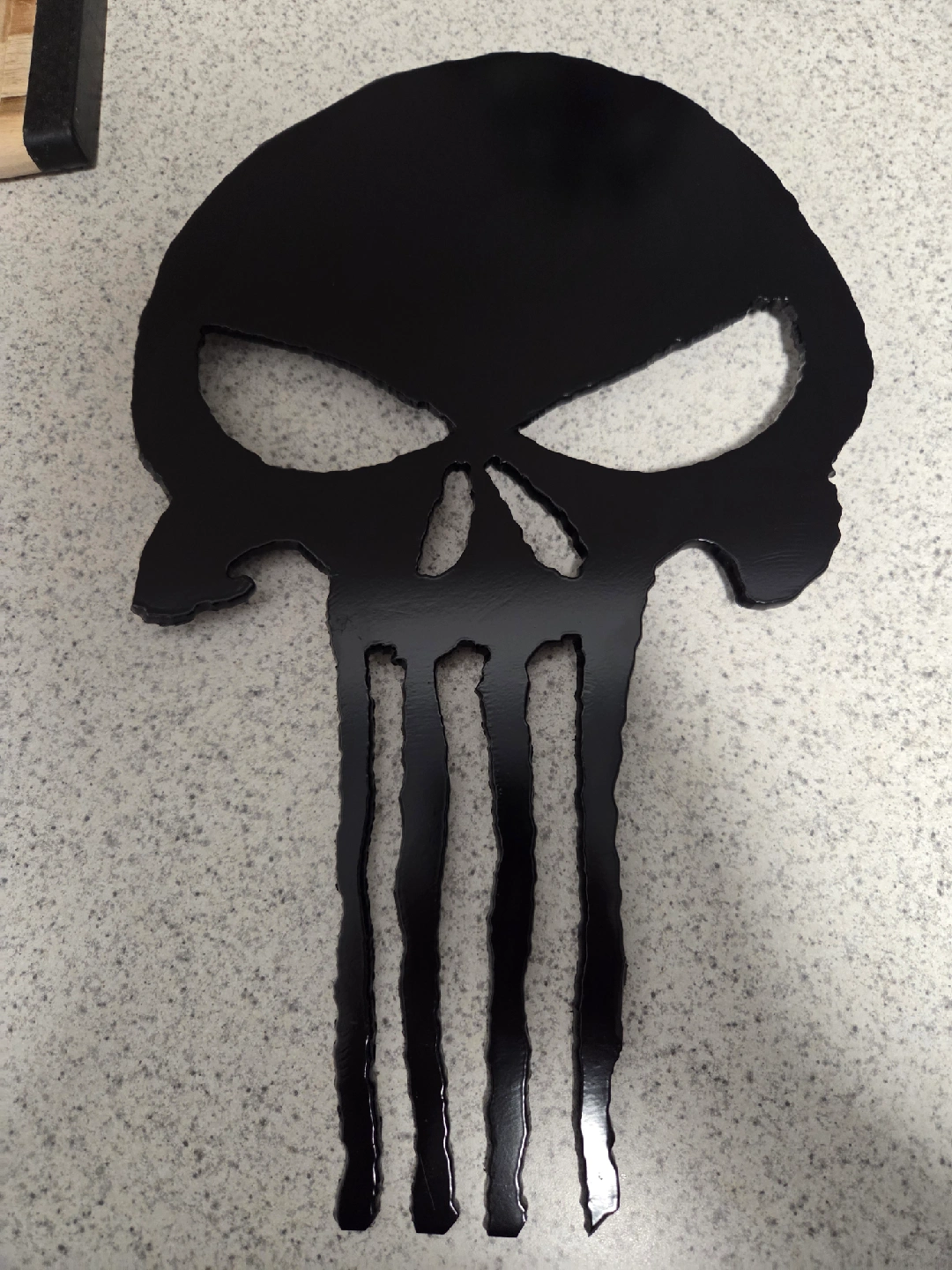 Metal Punisher skull wall decoration. Great for any Marvel fan's home!. Heavy gauge steel with glossy i industrial paint.