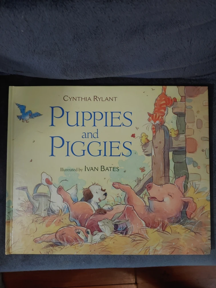 Selling a copy of "Puppies and Piggies" by Cynthia Rylant! It's a sweet book with lovely illustrations by Ivan Bates. Perfect for kids who love animals