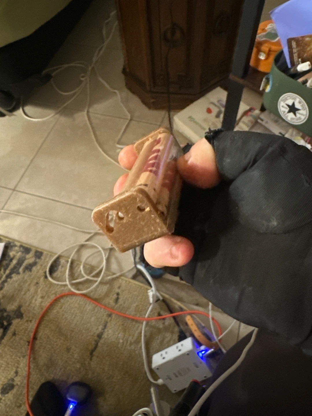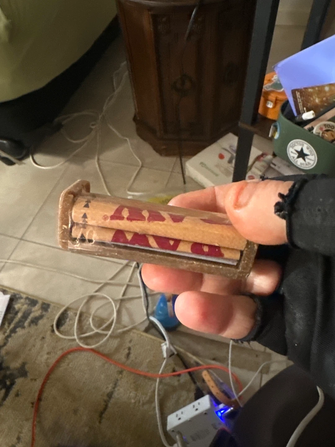 This is a RAW brand 70mm roller made of hemp plastic. It's designed for rolling cigarettes. The roller is brown and comes in a protective case.