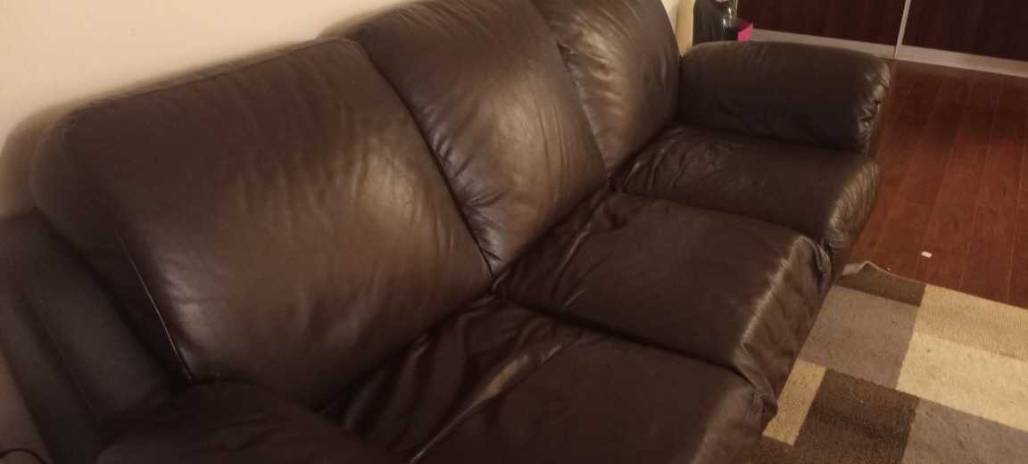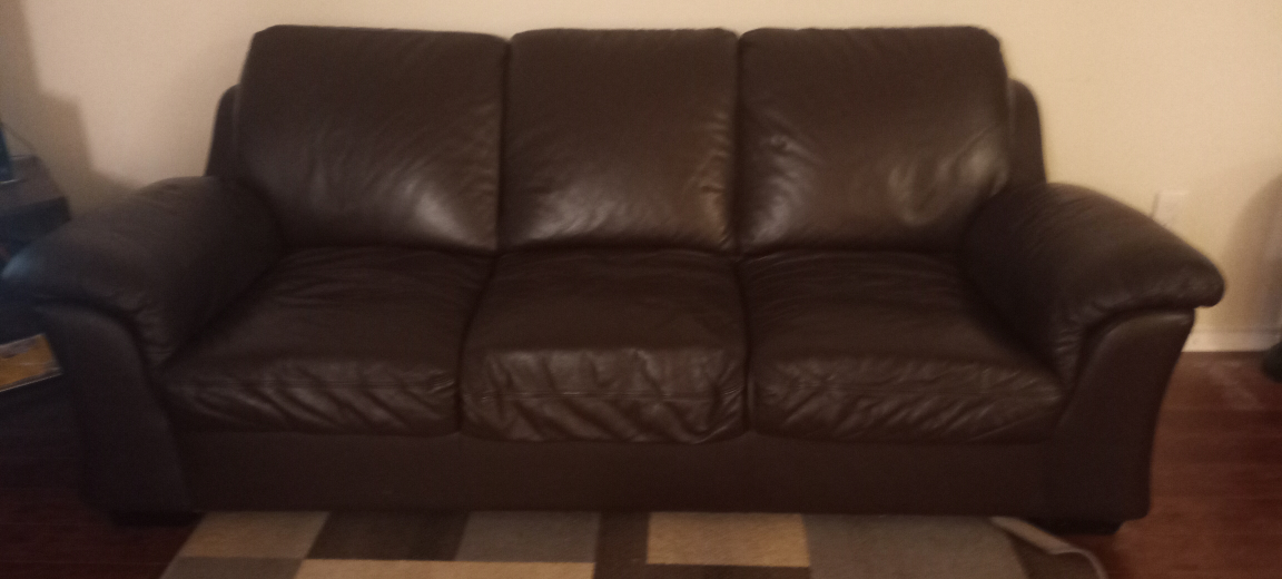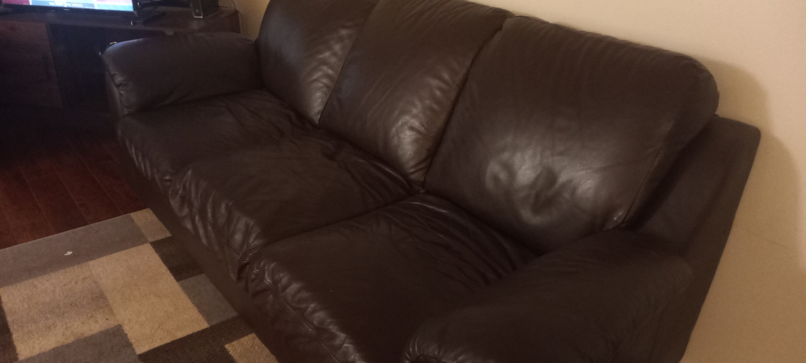 90Pure leather sofa (3 seater). Chocolate Brown color. Purchased from BRICK. Dimension: L/W/H= 92/30/36 inch. It is in fair condition. You can see for yourself before buying it. Pay at the pickup site. Pay in cash or e-transfer only.