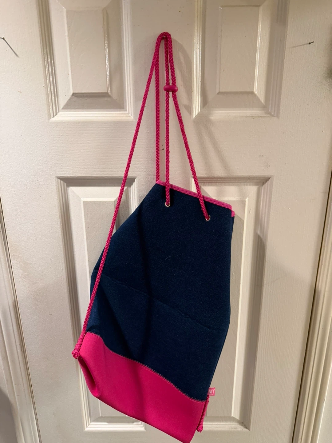 This is a navy blue drawstring backpack with bright pink accents. It has braided shoulder straps that double as a drawstring closure. The interior lining is also pink. It's a convenient size for everyday use!