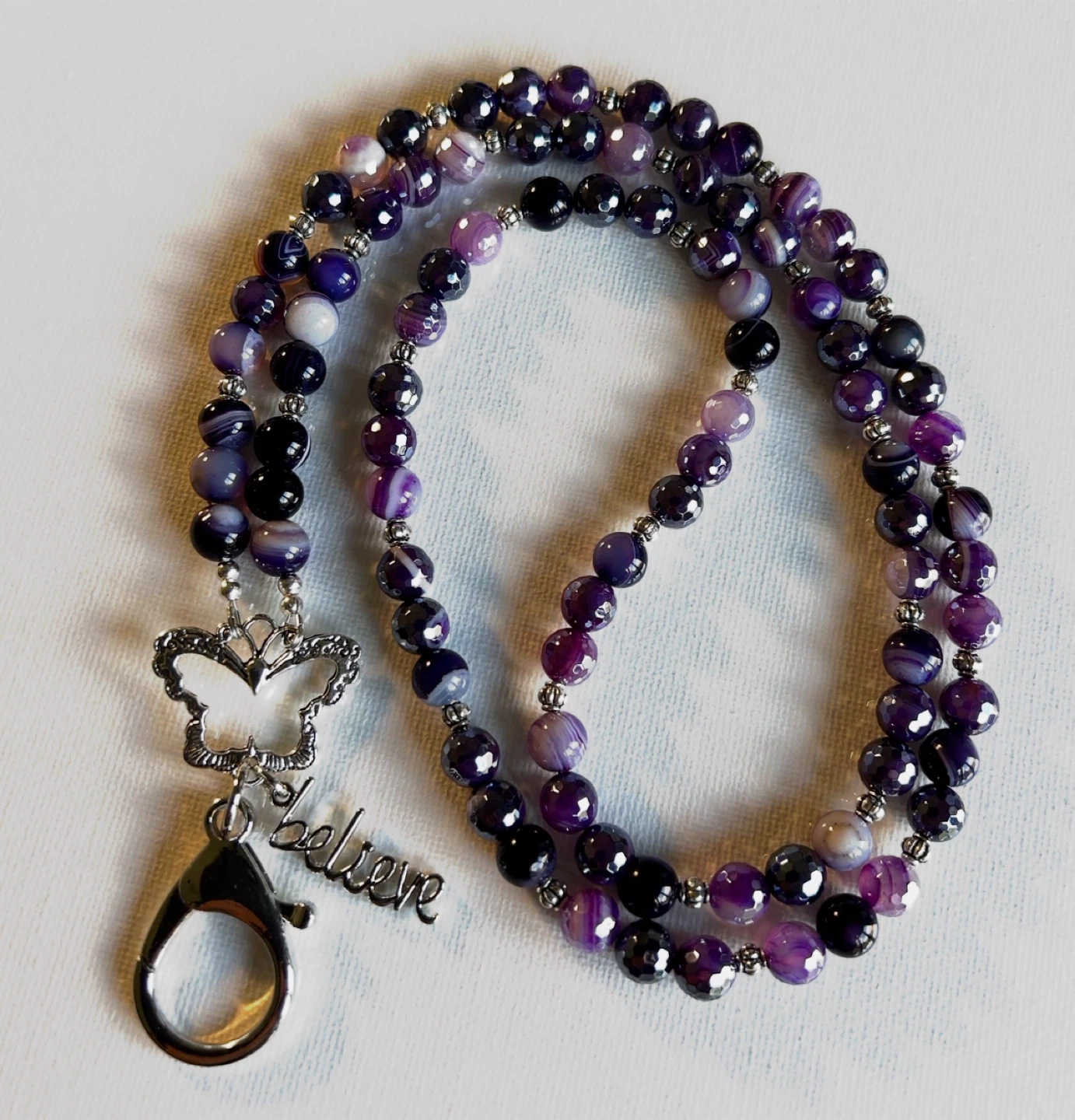 Purple Agate Beaded Lanyard with Butterfly Charm