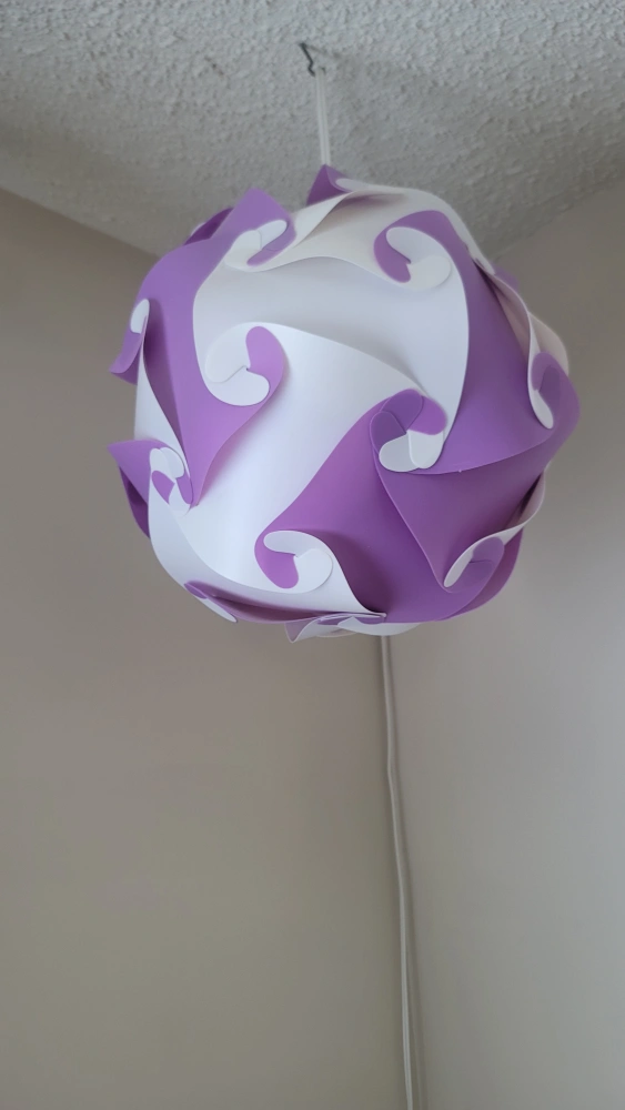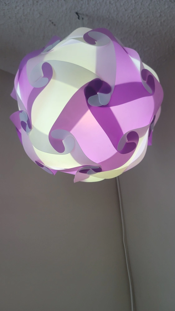 65Add a unique touch to your room with this jigsaw puzzle lamp! It features a fun purple and white design that will brighten up any space. It's in great condition and ready to hang 10 feet plus in cord Great condition Smoke pet free home