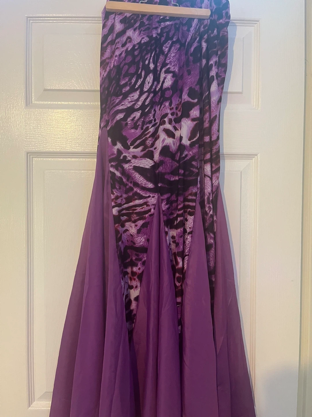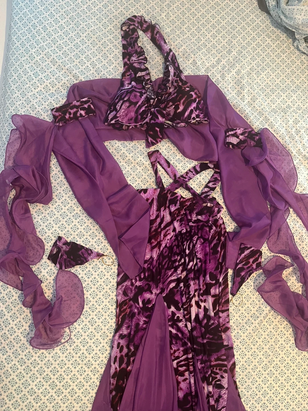 Selling a purple animal print belly dance costume that comes with a skirt (elastic waistband), bra top that ties up in the front, arm bands that connect from the upper to the fingers, and small veil. There is a tear in one of the arm bands as seen in the picture. This costume has never been worn. It’s a size S/M ladies.