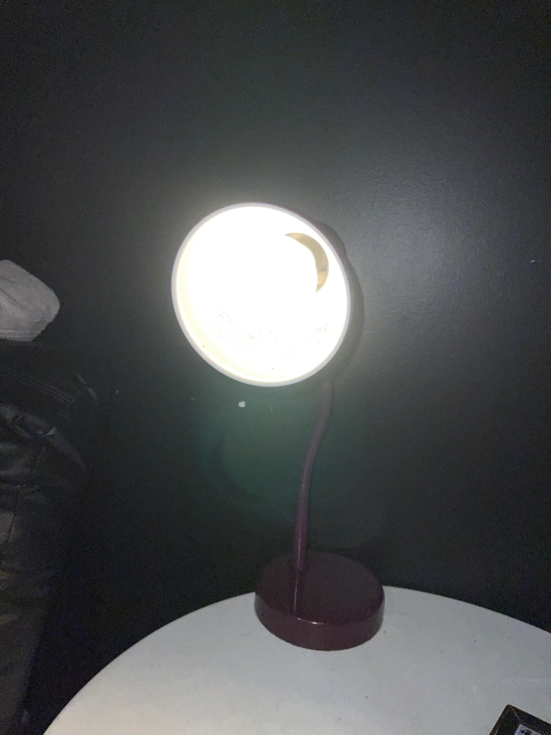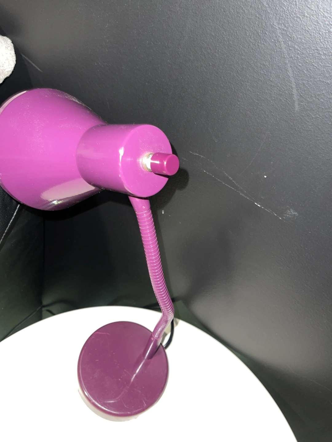72Adjustable gooseneck. Purple plastic body. Small, simple design. Good for a desk or bedside table.