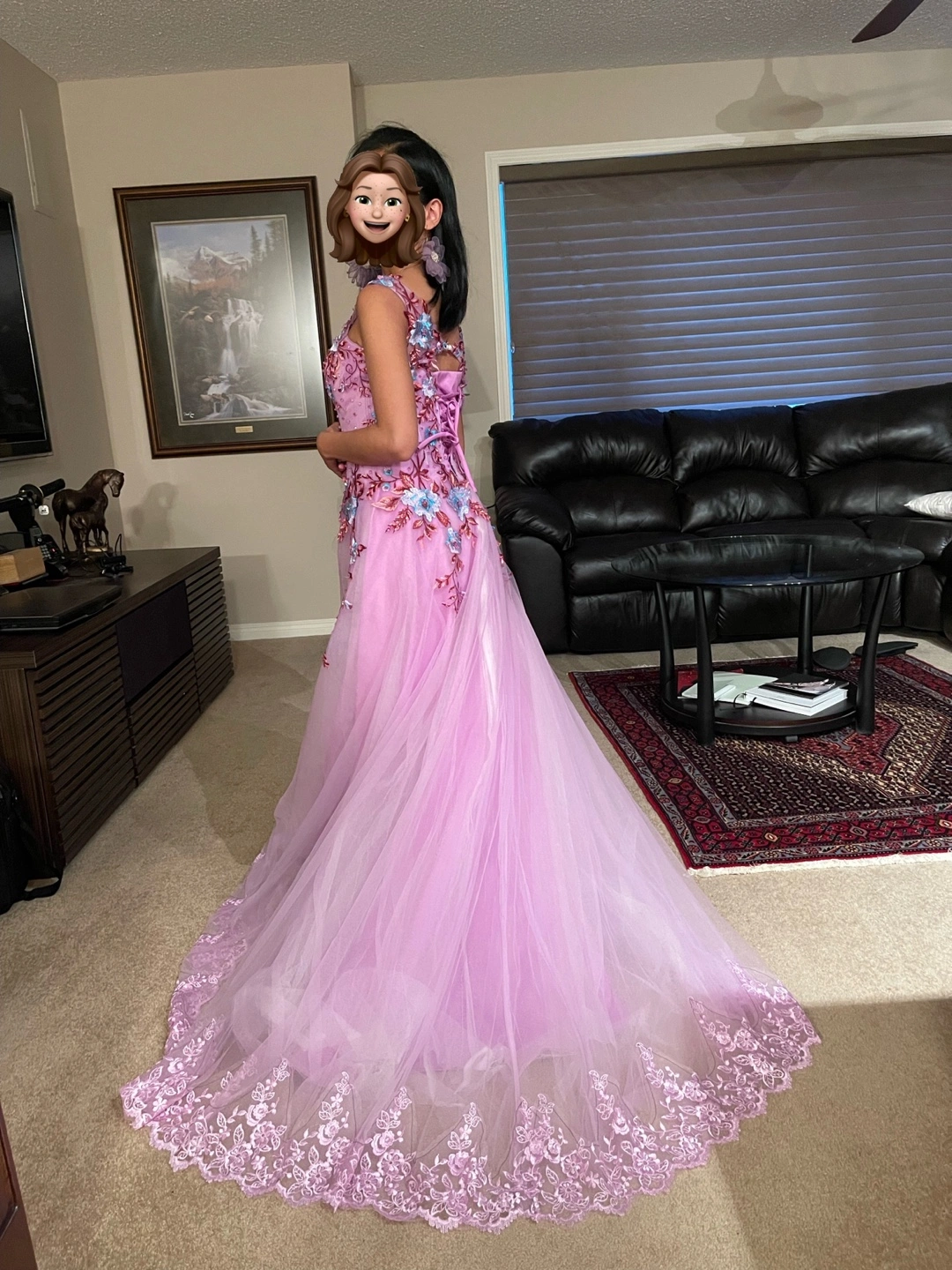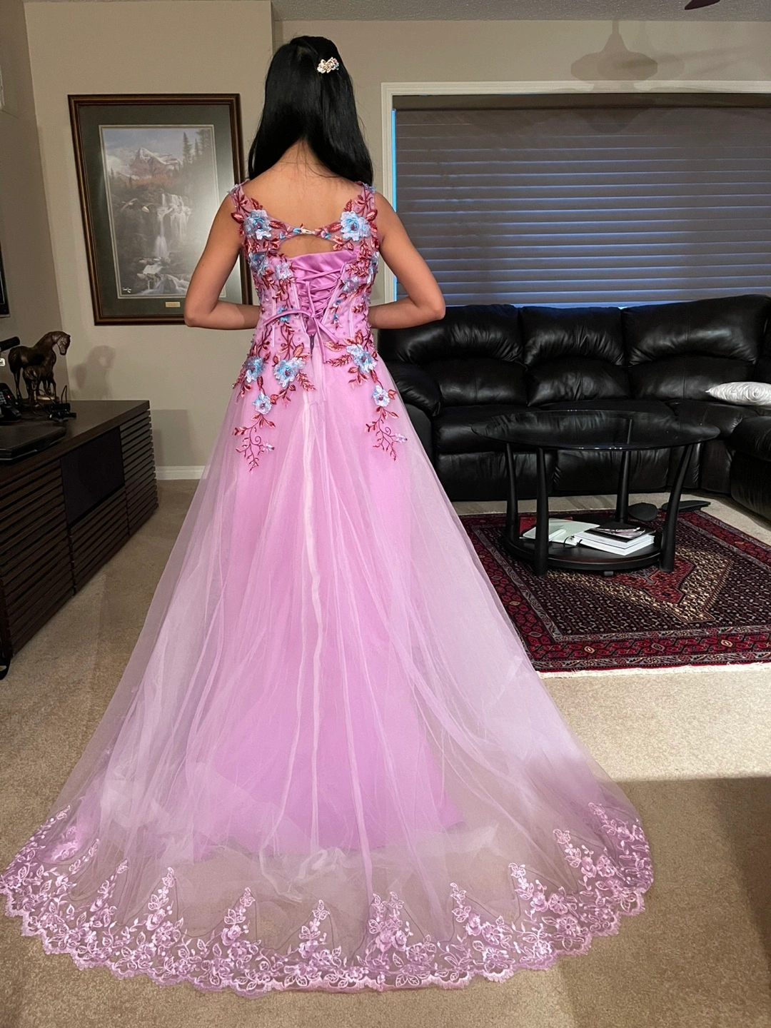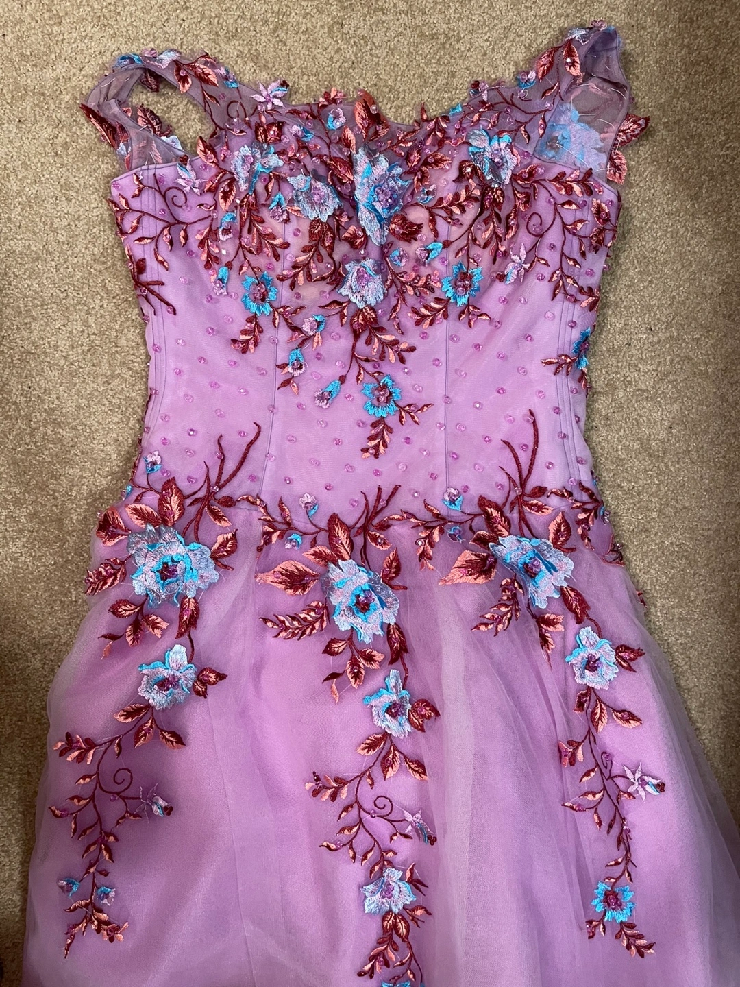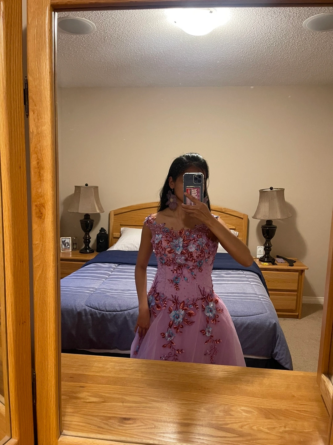 Selling a lovely lilac formal dress with beautiful floral detailing. It features a corset back and a long train, perfect for a special occasion. The dress has a delicate and elegant design, making it a standout piece for any event Size 6 (Small) Brand New Unique design (5 layered gown) Very pretty in person Buy at $xxx (name your price!) Rent at $150 (negotiable) Purple flower earrings are also for sale at $10 RFS: Originally bought for my wedding but ended up wearing a different gown Pick up Location: Aspen Stone SW (or 69th station)