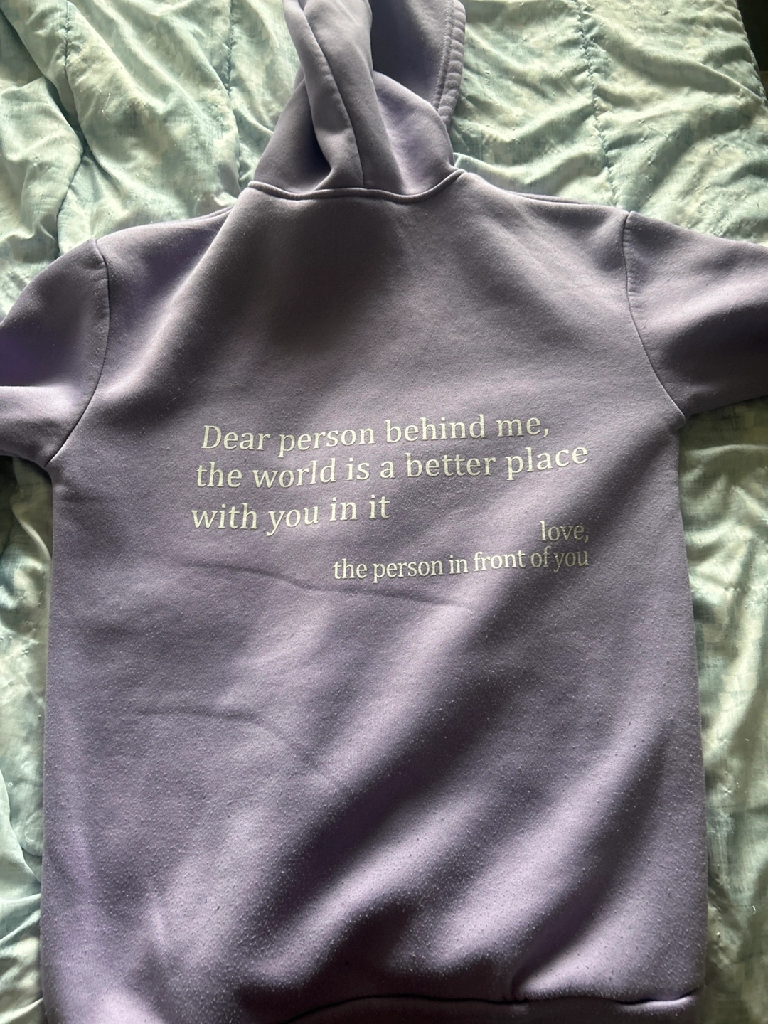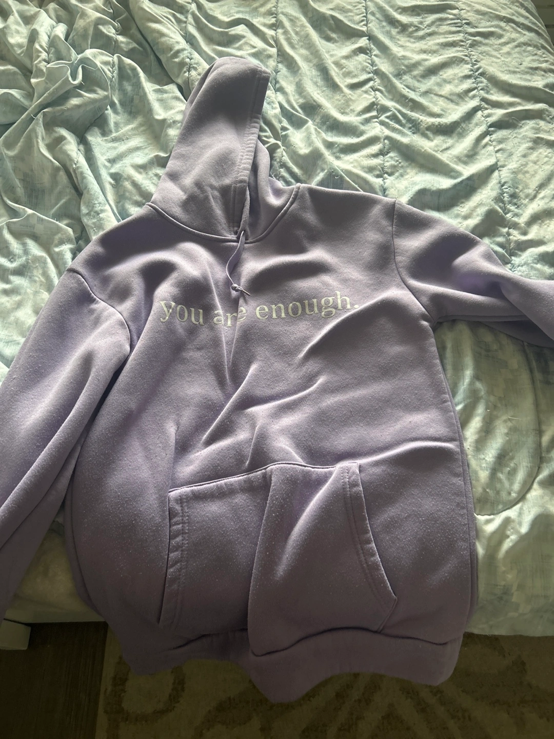 Selling a comfy purple hoodie, size small. The hoodie has the text 'you are enough' on the front and a longer message on the back. It's in great condition and ready for a new home!