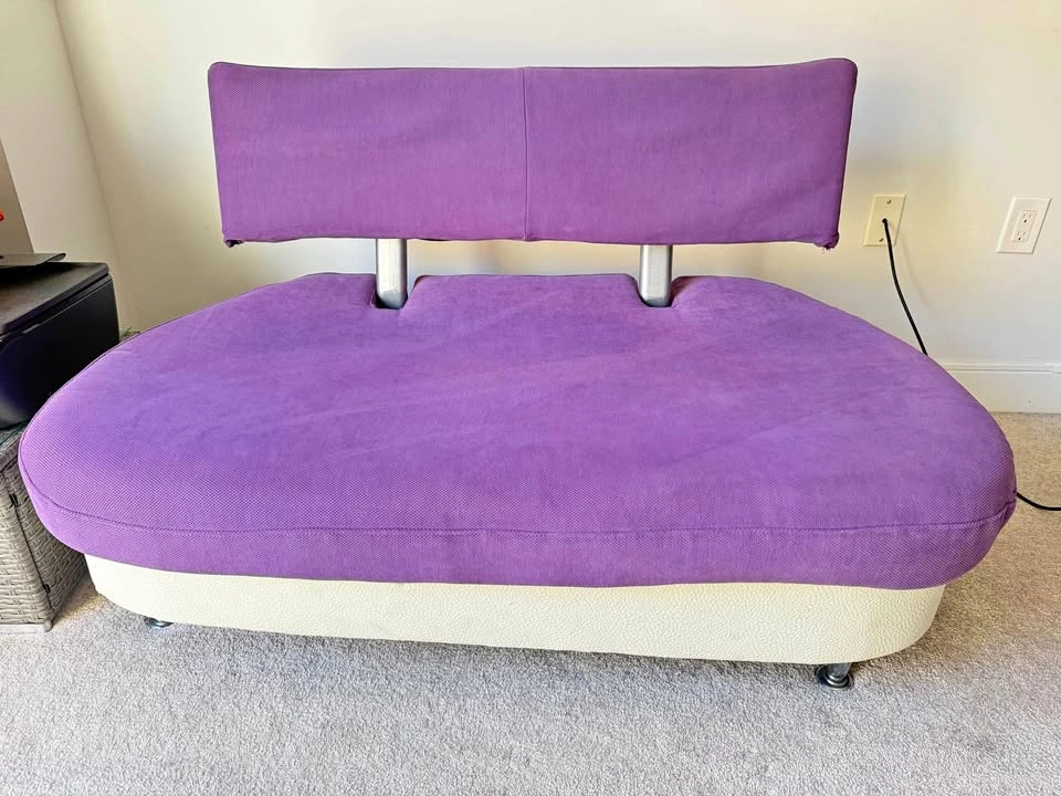 18Modern purple loveseat/accent chair (51.5” wide) with cream base and caster wheels. Unique design, comfortable seating. Legs need repair, reflected in price.