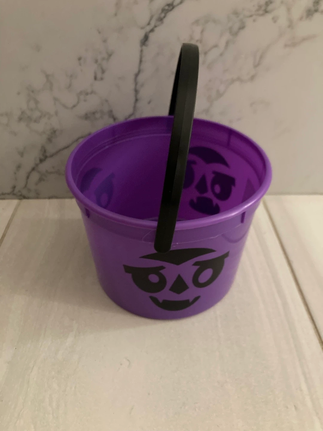 Here's a cute purple Halloween candy bucket! It has a black handle and a spooky face design on the front. Perfect for trick-or-treating!