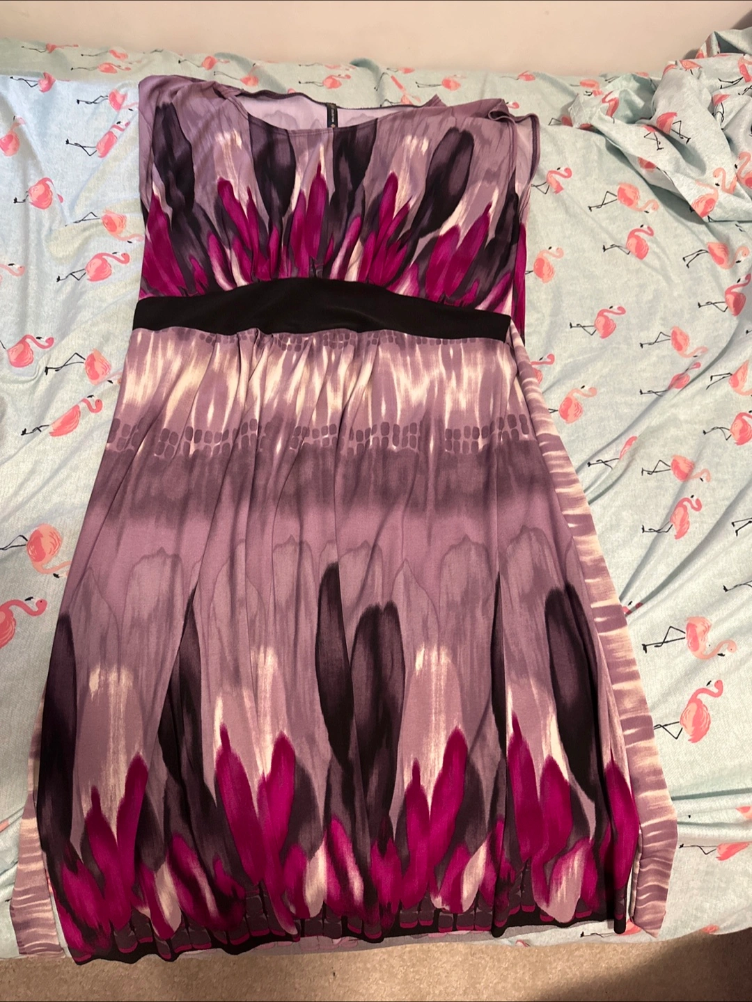 A cute purple dress with a unique pattern! It has a black band around the waist. Perfect for a casual outing or a summer day