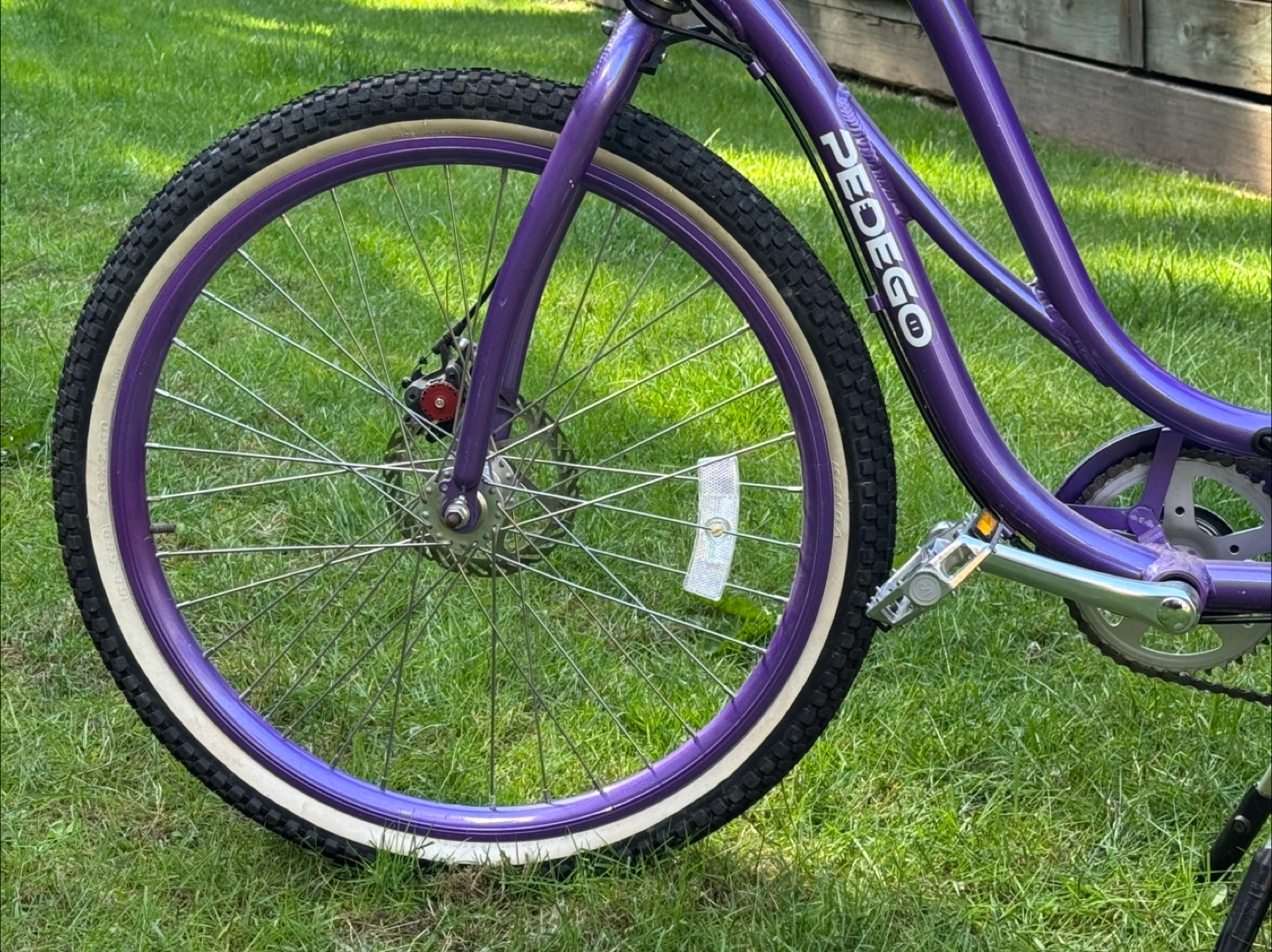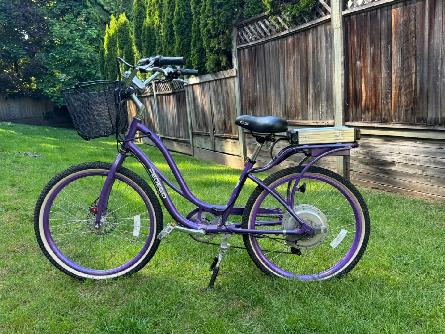 60Pre-owned Pedego electric bicycle. Purple frame. Includes a front basket. Rear mounted battery. This bike has only been used a couple of times and has been in storage. Excellent condition with battery and charger. This bike retails for $3,500.00