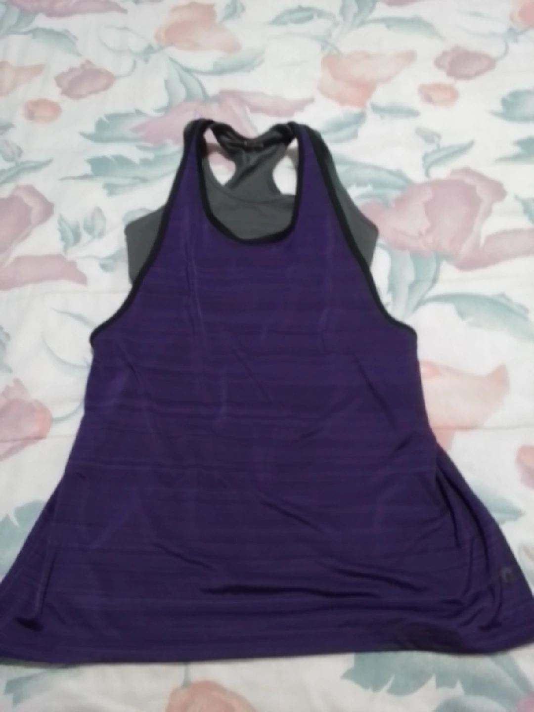 65Selling a purple tank top with a built-in bra. It's in great condition and perfect for workouts or casual wear! The tank has a sporty design with a racerback style.