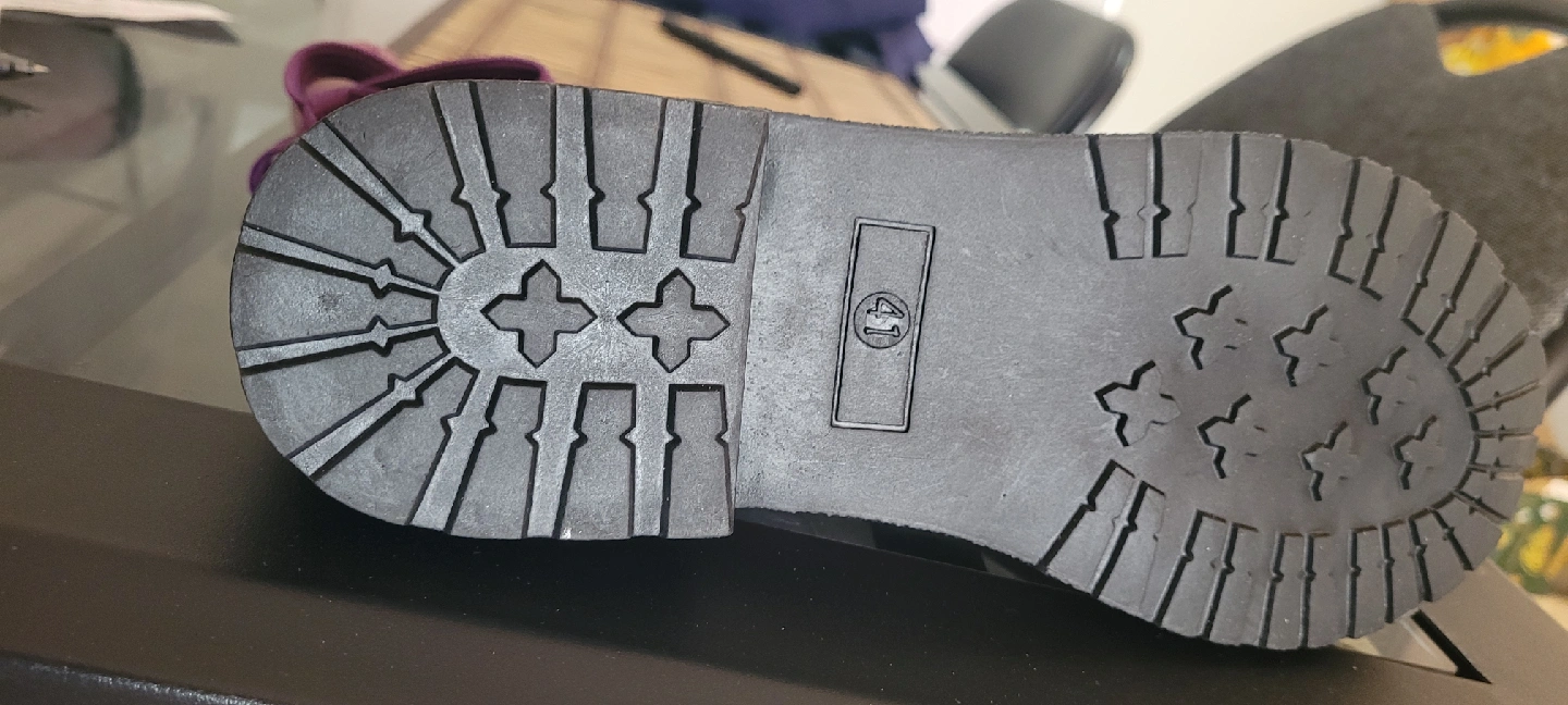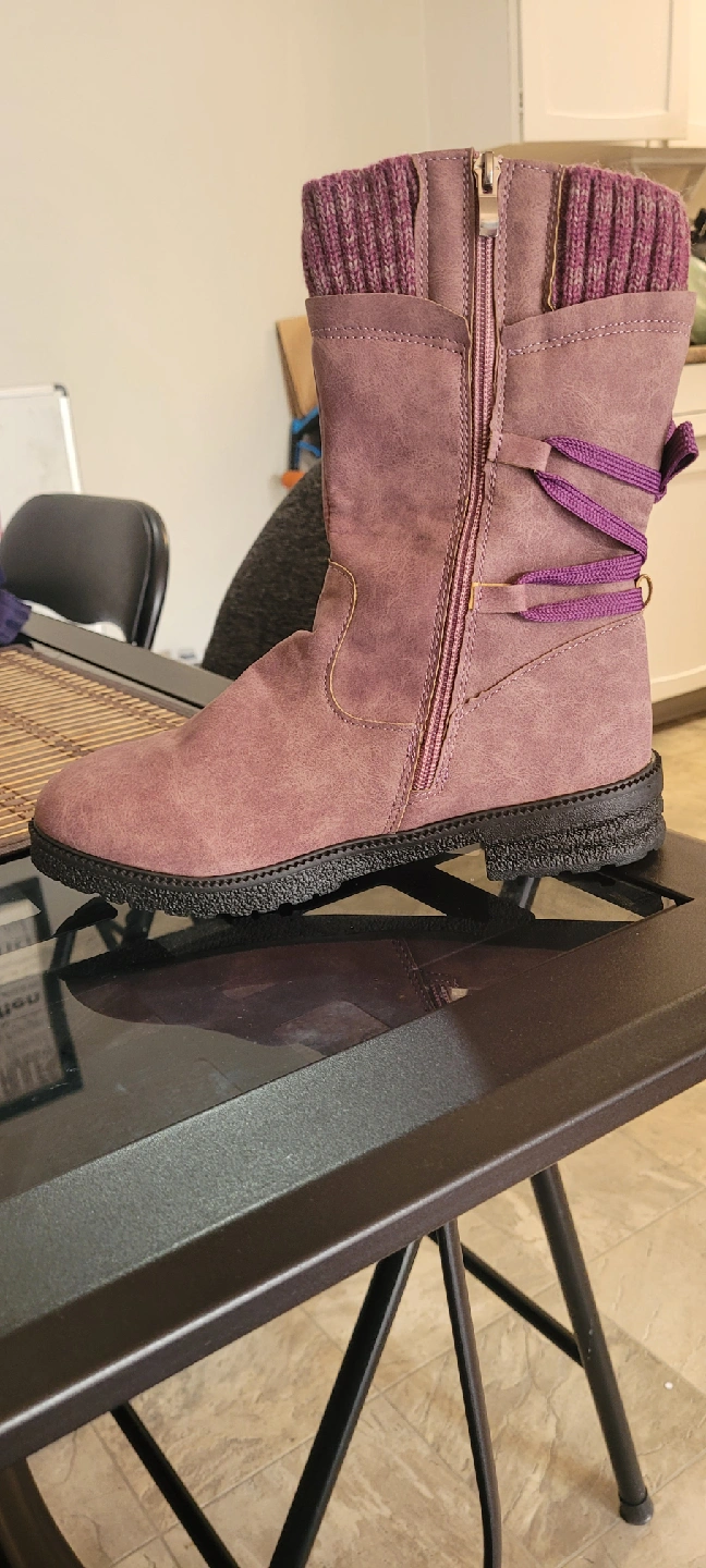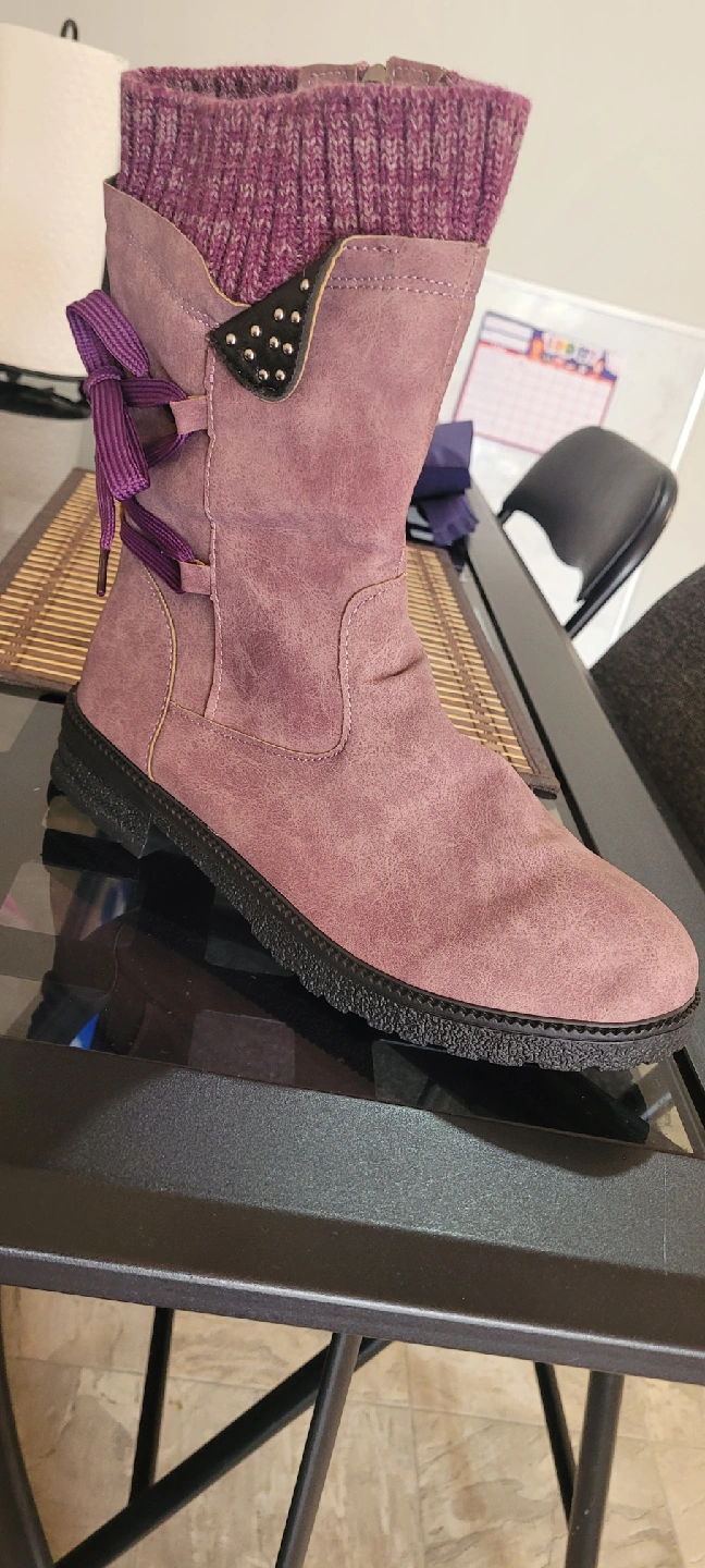 10Cozy purple winter boots with a knitted sock-like upper. They feature a side zipper for easy wear and decorative laces. The soles are durable and ready for Canadian winters! Size 41