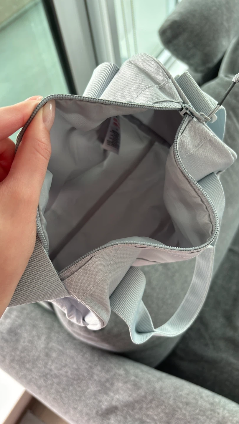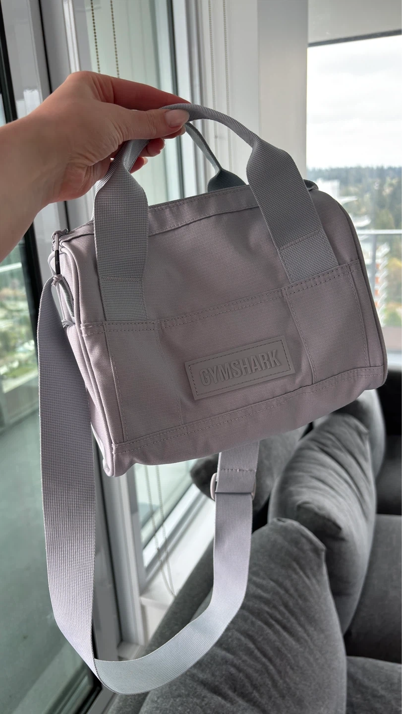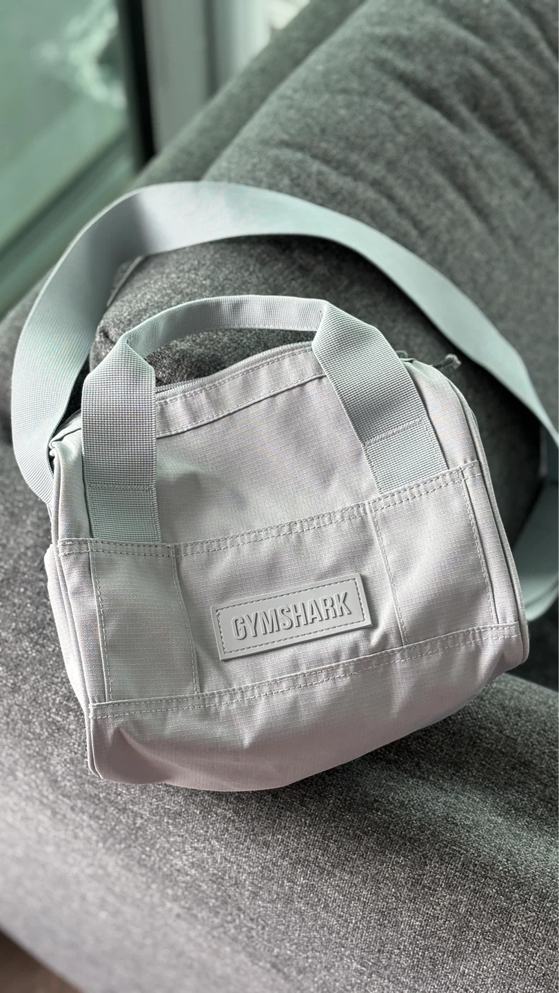 A compact Gymshark duffle bag in a light grey/blue colour. It's got a zip closure and both top handles and a detachable shoulder strap. Perfect for gym essentials!