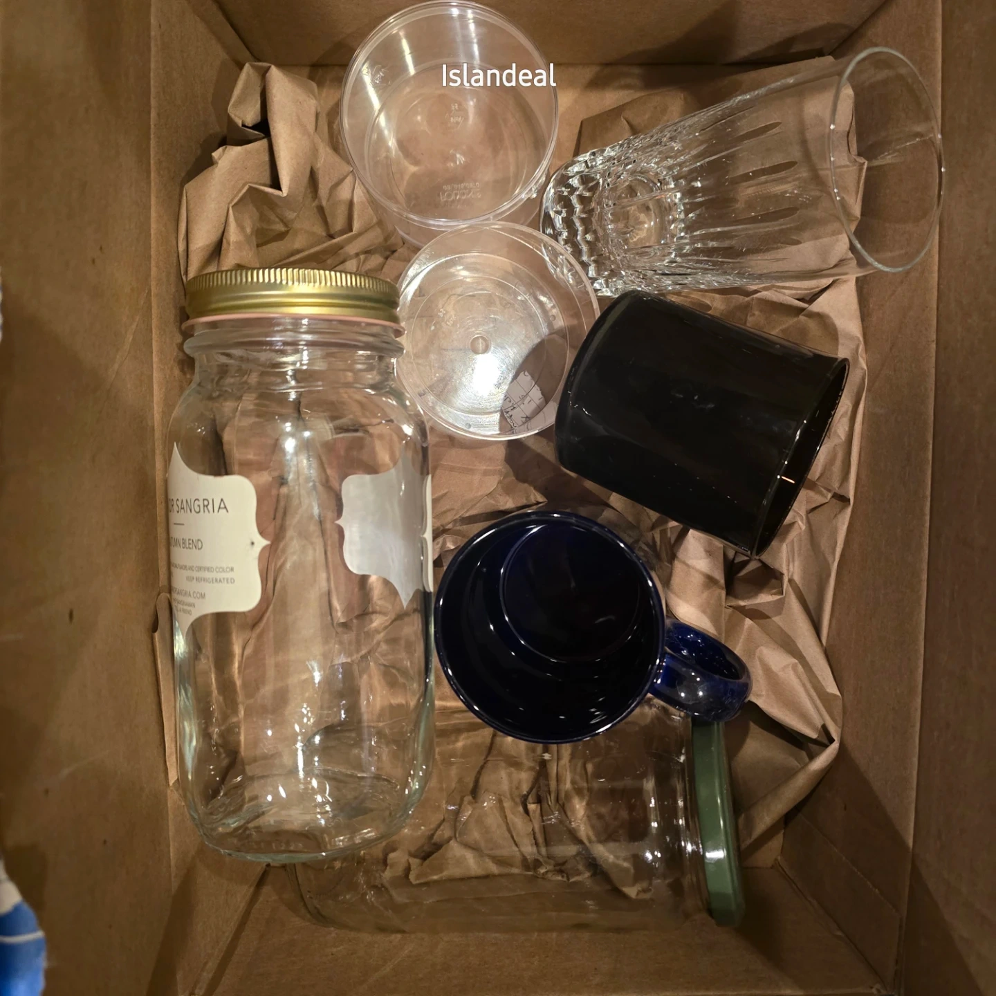 This set includes a large glass jar with a metal lid, a navy blue mug with a handle, and a clear decorative tumbler. There are also two small clear plastic cups. It's a nice assortment for drinks or storage!