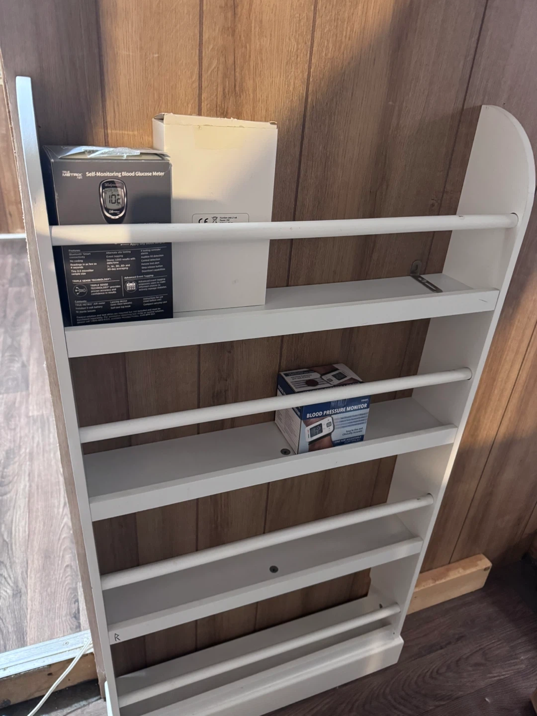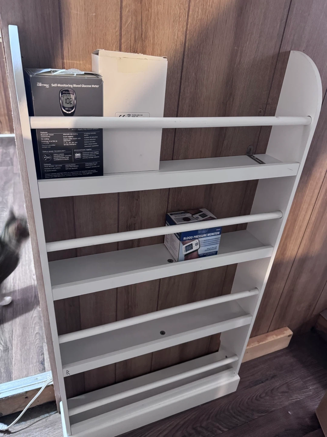 This is a white, wall-mounted shelf unit with five tiers. It's perfect for displaying books or other items. The shelf measures approximately 24 inches wide and 48 inches tall.